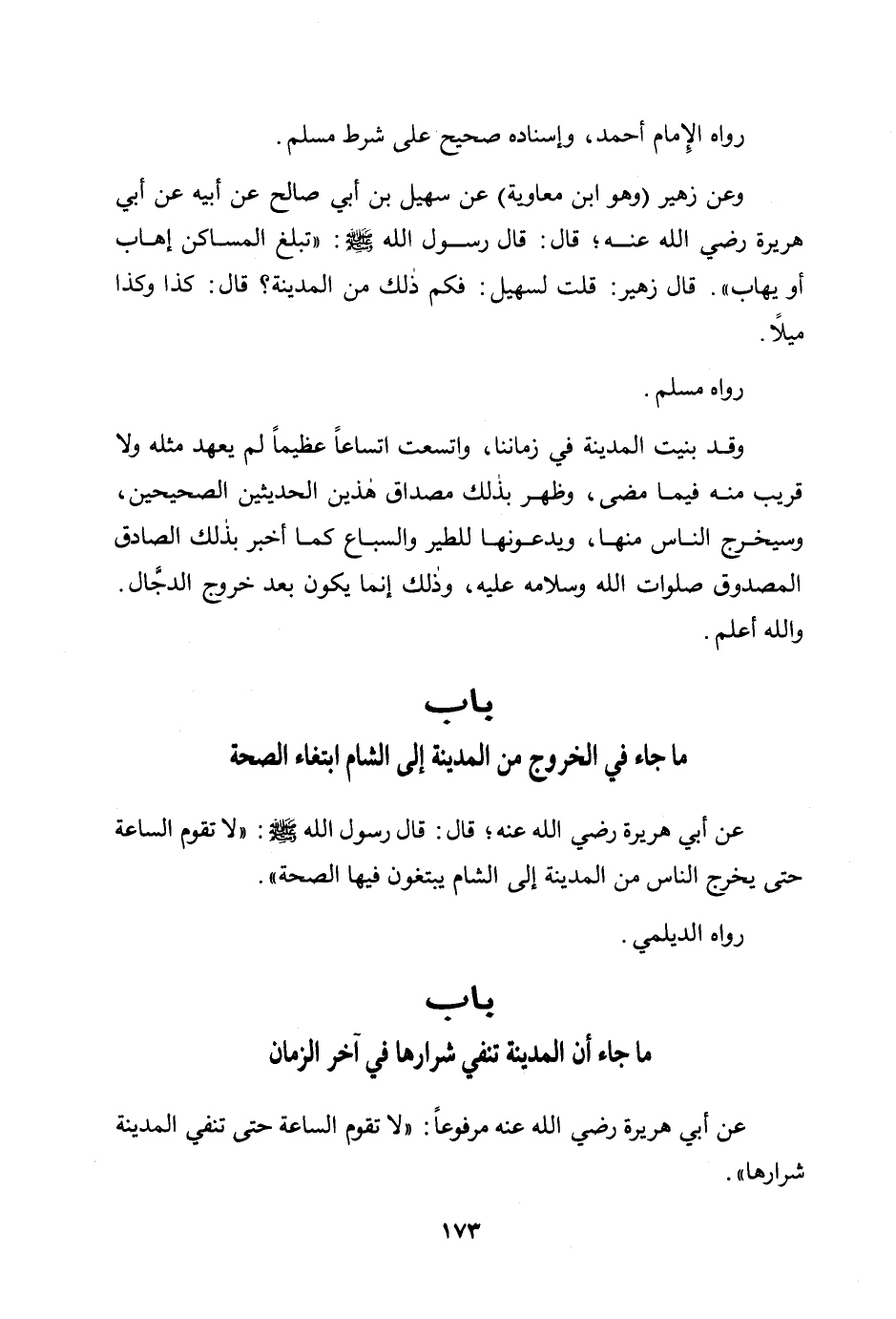 رواه الإمام أحمد، وإسناده صحيح على شرط مسلم. وعن زهير (وهو ابن معاوية) عن سهيل بن أبي صالح عن أبيه عن أبي هريرة رضي الله عنه؛ قال: قال رسول الله صلى الله عليه وسلم: «تبلغ المساكن إهاب أو يهاب» . قال زهير: قلت لسهيل: فكم ذلك من المدينة؟ قال: كذا وكذا ميلًا.