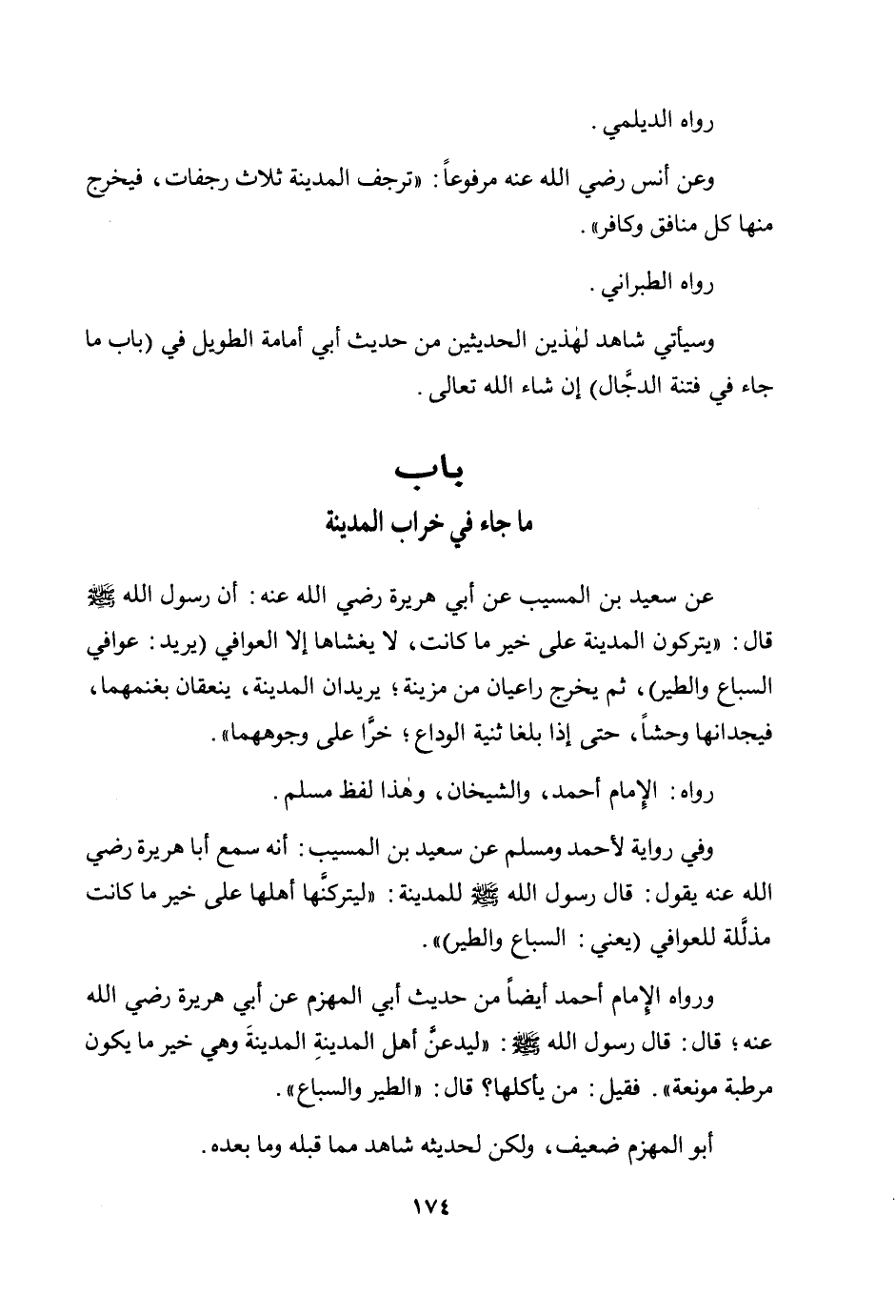 ورواه الإمام أحمد أيضًا من حديث أبي المهزم عن أبي هريرة رضي الله عنه؛ قال: قال رسول الله صلى الله عليه وسلم: «"ليدعن أهل المدينة المدينة وهي خير ما يكون مرطبة مونعة". فقيل: من يأكلها؟ قال: "الطير والسباع» .