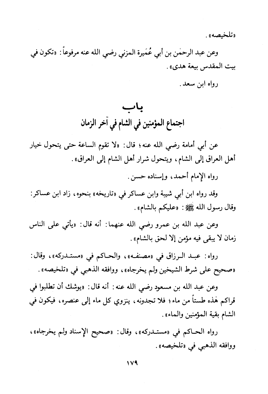 وعن عبد الله بن عمرو رضي الله عنهما: أنه قال: "يأتي على الناس زمان لا يبقى فيه مؤمن إلا لحق بالشام".