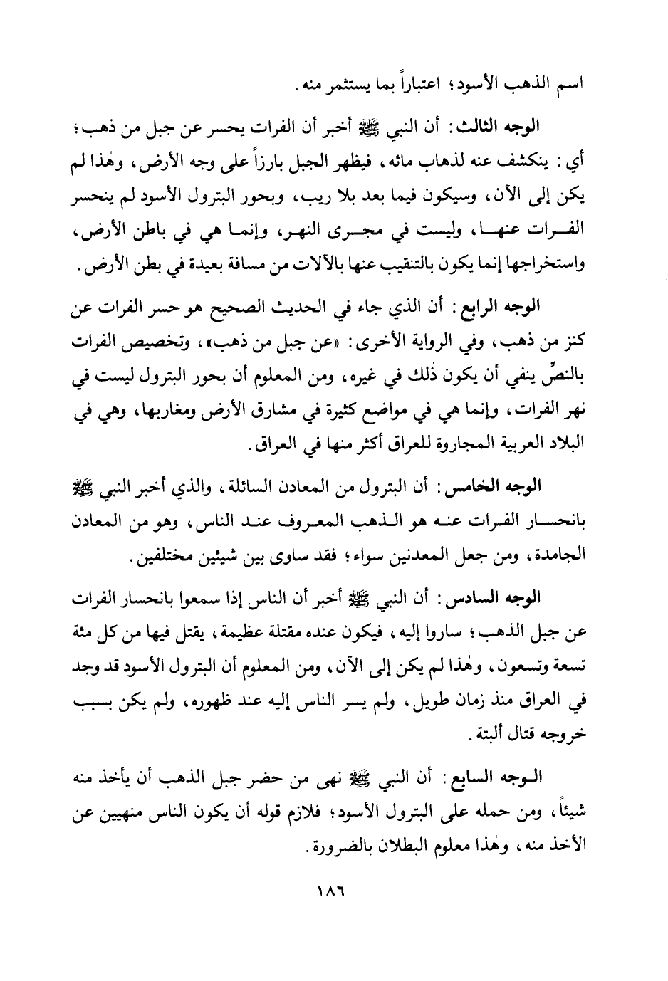 الوجه الخامس: أن البترول من المعادن السائلة، والذي أخبر النبي صلى الله عليه وسلم بانحسار الفرات عنه هو الذهب المعروف عند الناس، وهو من المعادن الجامدة، ومن جعل المعدنين سواء؛ فقد ساوى بين شيئين مختلفين.