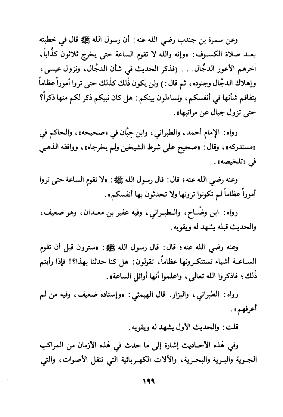 وعن سمرة بن جندب رضي الله عنه: أن رسول الله صلى الله عليه وسلم قال في خطبته بعد صلاة الكسوف: «وإنه والله لا تقوم الساعة حتى يخرج ثلاثون كذابًا، آخرهم الأعور الدجال.... (فذكر الحديث في شأن الدجال، ونزول عيسى، وإهلاك الدجال وجنوده، ثم قال: (ولن يكون ذلك كذلك حتى تروا أمورًا عظامًا يتفاقم شأنها أنفسكم، وتساءلون بينكم: هل كان نبيكم ذكر لكم منها ذكرًا؟ حتى تزول جبال عن مراتبها» .