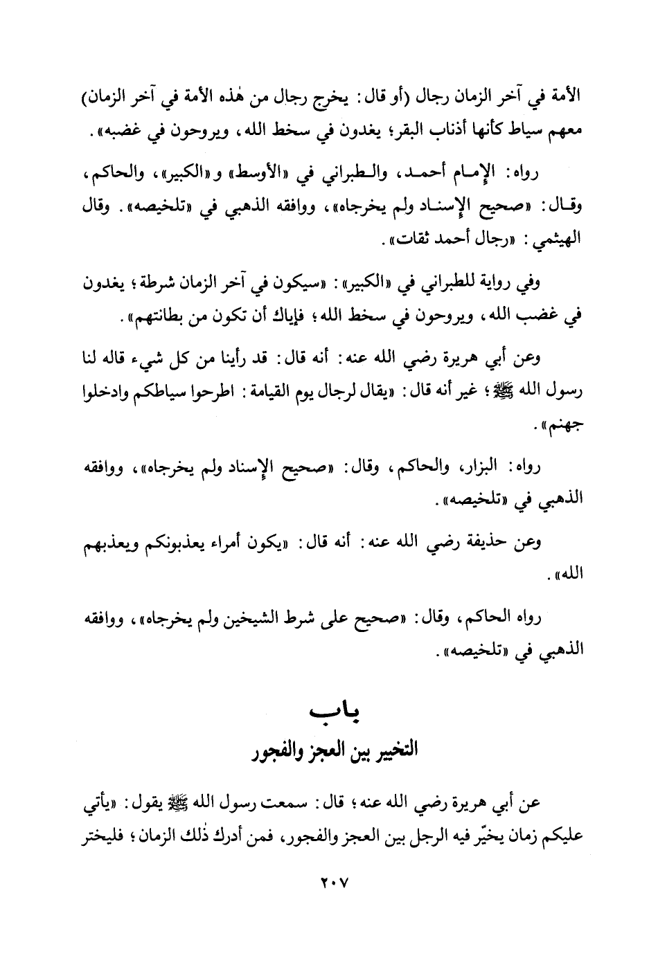 عن أبي هريرة رضي الله عنه؛ قال: سمعت رسول الله صلى الله عليه وسلم يقول: «يأتي عليكم زمان يخير فيه الرجل بين العجز والفجور، فمن أدرك ذلك الزمان؛ فليختر»