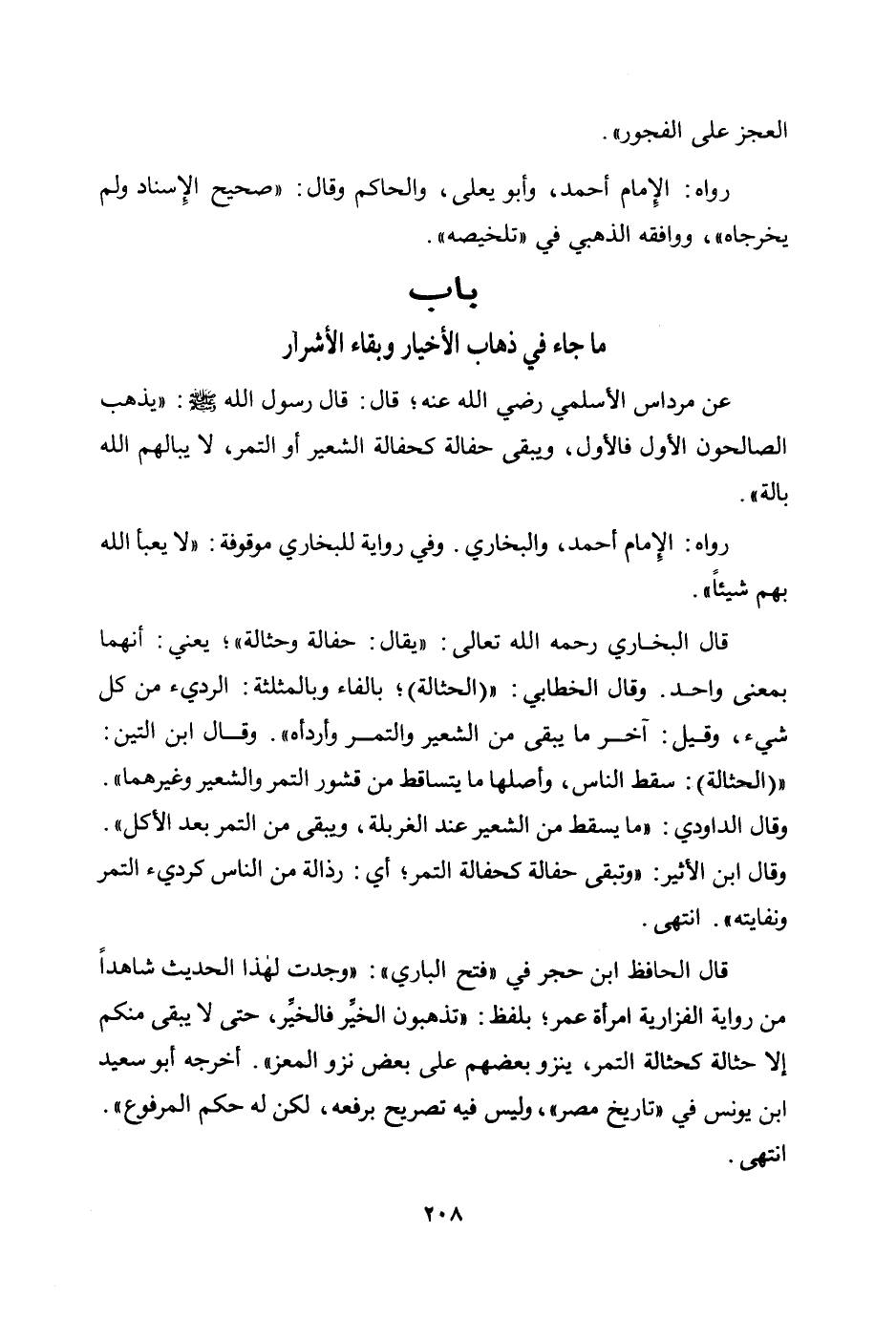 عن مرداس الأسلمي رضي الله عنه؛ قال: قال رسول الله صلى الله عليه وسلم: «يذهب الصالحون الأول فالأول، ويبقى حفالة كحفالة الشعير أو التمر، لا يباليهم الله بالة» .