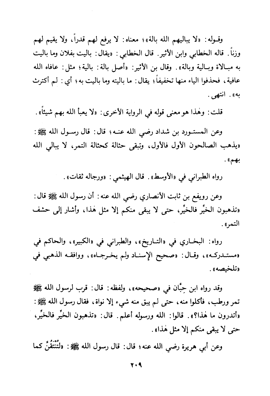 وعن المستورد بن شداد رضي الله عنه؛ قال: قال رسول الله صلى الله عليه وسلم: «يذهب الصالحون الأول فالأول، وتبقى حثالة كحثالة التمر، لا يبالي الله بهم» .