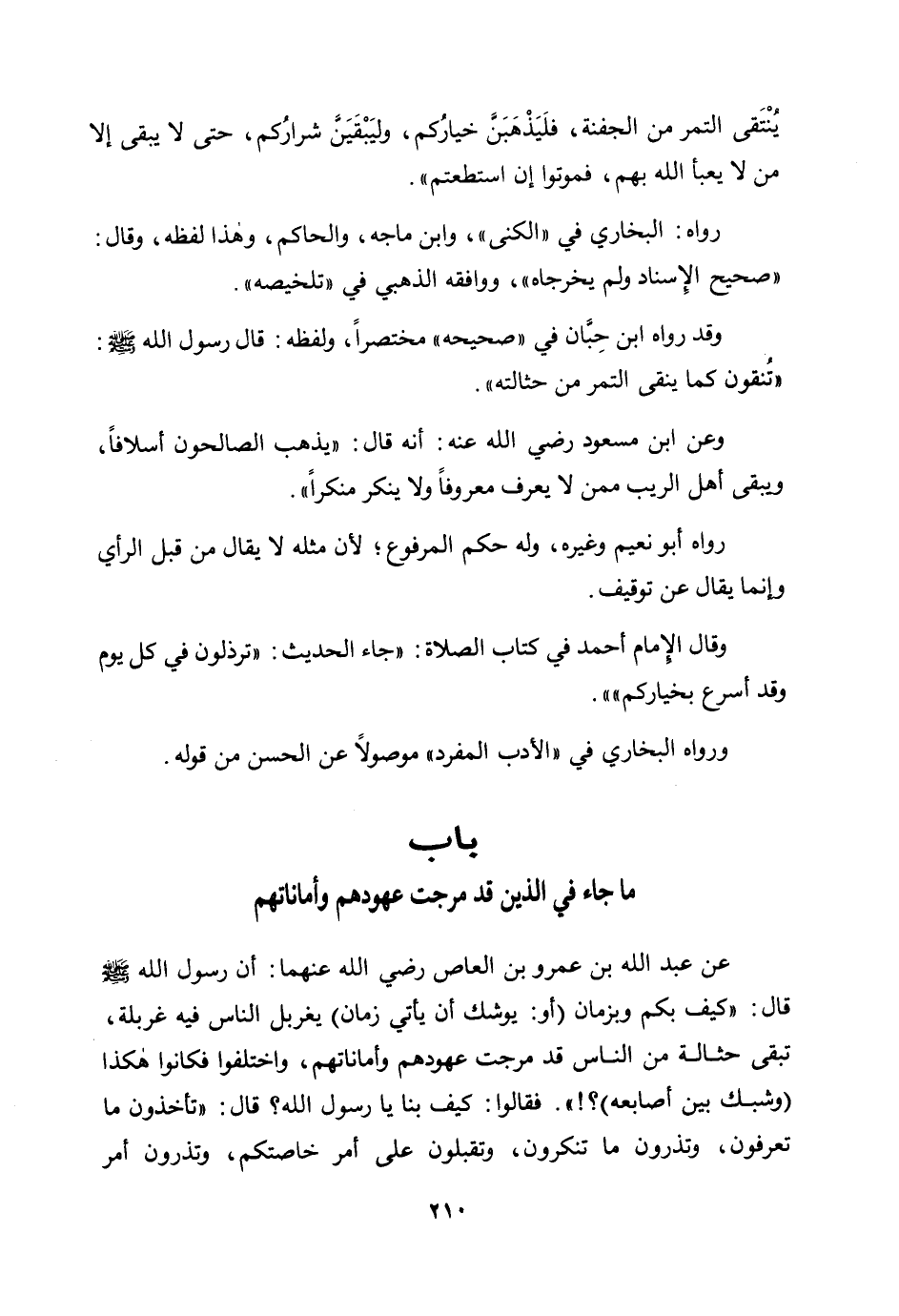 عن عبد الله بن عمرو بن العاص رضي الله عنهما: أن رسول الله صلى الله عليه وسلم قال: «"كيف بكم وبزمان (أو: يوشك أن يأتي زمان) يغربل الناس فيه غربلة، تبقى حثالة من الناس قد مرجت عهودهم وأماناتهم، واختلفوا فكانوا هكذا (وشبك بين أصابعه) ؟ ! ". فقالوا: كيف بنا يا رسول الله؟ قال: "تأخذون ما تعرفون، وتذرون ما تنكرون، وتقبلون على أمر خاصتكم، وتذرون أمر»