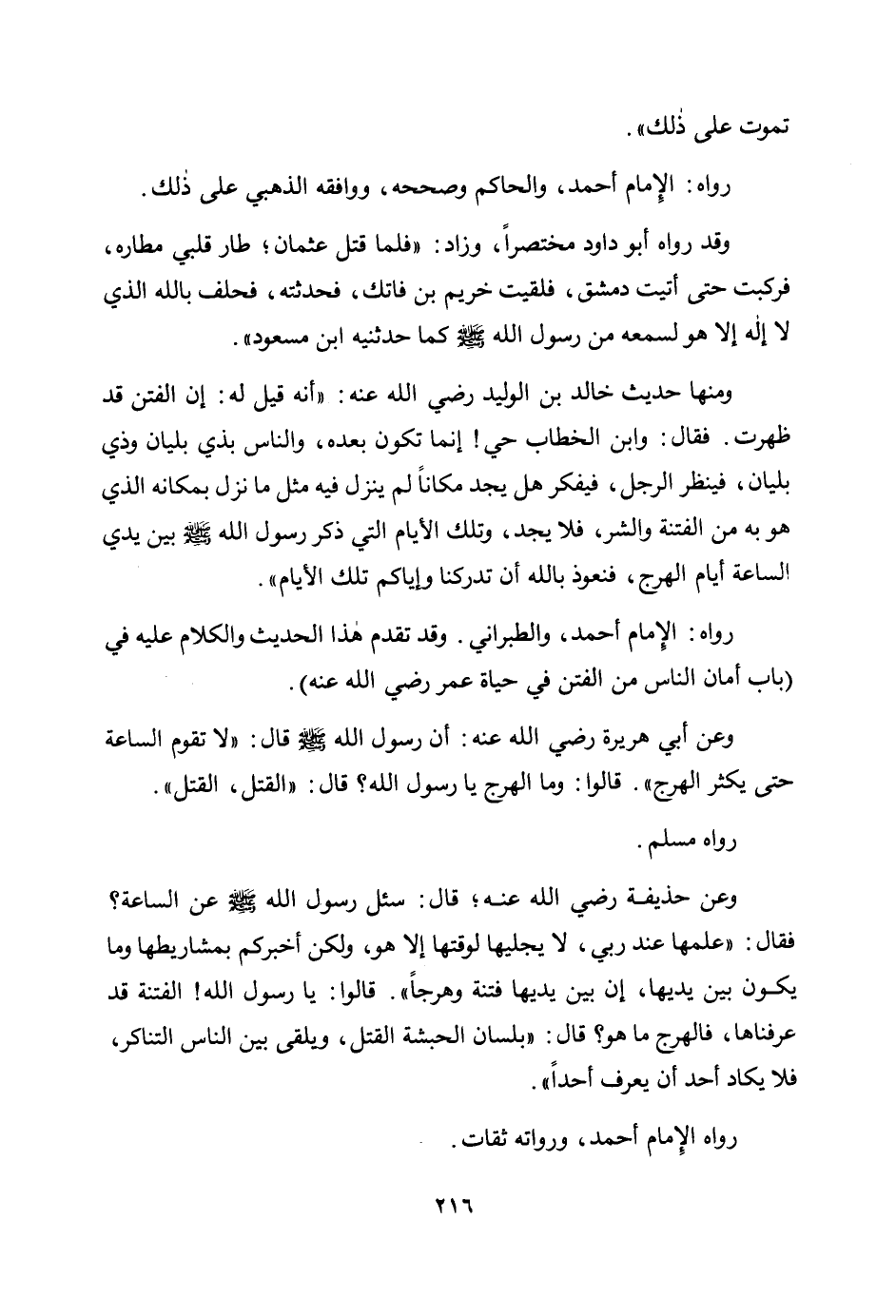 ومنها حديث خالد بن الوليد رضي الله عنه: "أنه قيل له: إن الفتن قد ظهرت. فقال: وابن الخطاب حي! إنما تكون بعده، والناس بذي بليان وذي بليان، فينظر الرجل، فيفكر هل يجد مكانًا لم ينزل فيه مثل ما نزل بمكانه الذي هو به من الفتنة والشر، فلا يجد، وتلك الأيام التي ذكر رسول الله صلى الله عليه وسلم بين يدي الساعة أيام الهرج، فنعوذ بالله أن تدركنا وإياكم تلك الأيام ".