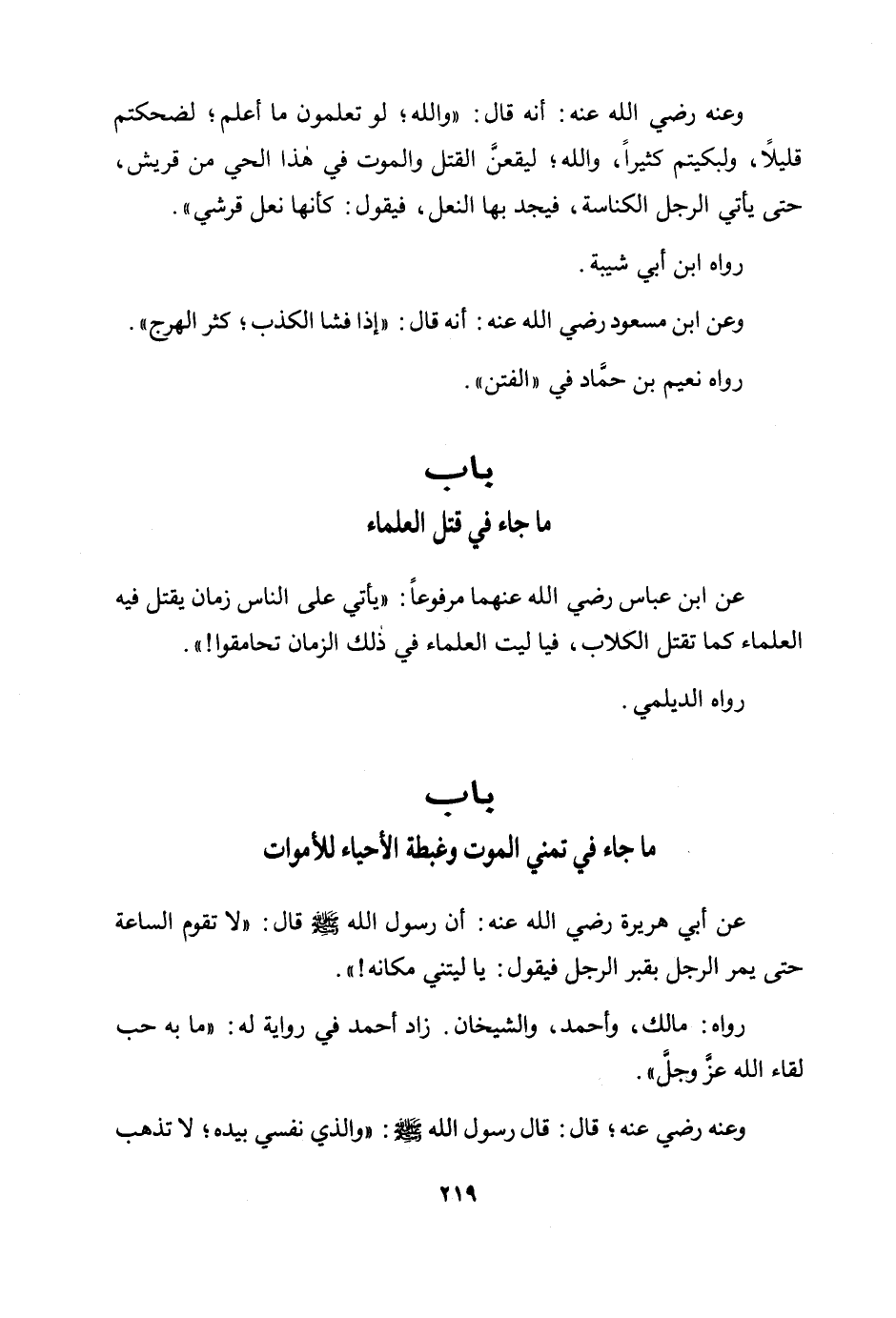 عن ابن عباس رضي الله عنهما مرفوعًا: «يأتي على الناس زمان يقتل فيه العلماء كما تقتل الكلاب، فيا ليت العلماء في ذلك الزمان تحامقوا!» .