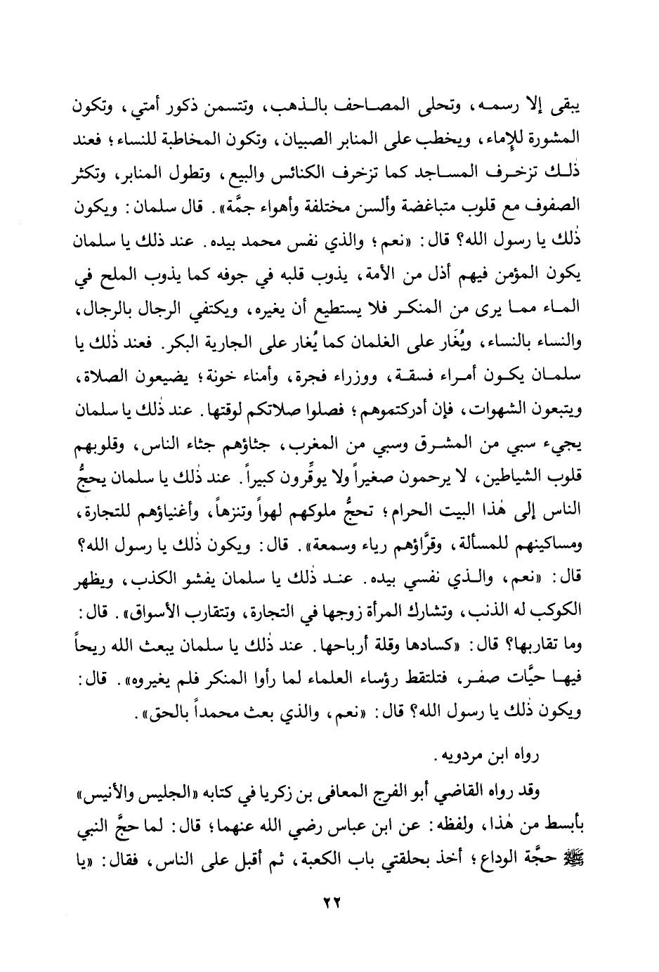 «يبقى إلا رسمه، وتحلى المصاحف بالذهب، وتتسمن ذكور أمتي، وتكون المشورة للإماء، ويخطب على المنابر الصبيان، وتكون المخاطبة للنساء؛ فعند ذلك تزخرف المساجد كما تزخرف الكنائس والبيع، وتطول المنابر، وتكثر الصفوف مع قلوب متباغضة وألسن مختلفة وأهواء جمة" قال سلمان: ويكون ذلك يا رسول الله؟ قال: "نعم؛ والذي نفس محمد بيده. عند ذلك يا سلمان يكون المؤمن فيهم أذل من الأمة، يذوب قلبه في جوفه كما يذوب الملح في الماء مما يرى من المنكر فلا يستطيع أن يغيره، ويكتفي الرجال بالرجال، والنساء بالنساء، ويغار على الغلمان كما يغار على الجارية البكر. فعند ذلك يا سلمان يكون أمراء فسقة، ووزراء فجرة، وأمناء خونة؛ يضيعون الصلاة، ويتبعون الشهوات، فإن أدركتموهم؛ فصلوا صلاتكم لوقتها. عند ذلك يا سلمان يجيء سبي من المشرق وسبي من المغرب، جثاؤهم جثاء الناس، وقلوبهم قلوب الشياطين، لا يرحمون صغيرًا ولا يوقرون كبيرًا. عند ذلك يا سلمان يحج الناس إلى هذا البيت الحرام؛ تحج ملوكهم لهوًا وتنزهًا، وأغنياؤهم للتجارة، ومساكينهم للمسألة، وقراؤهم رياء وسمعة" قال: ويكون ذلك يا رسول الله؟ قال: "نعم، والذي نفسي بيده. عند ذلك يا سلمان يفشو الكذب، ويظهر الكوكب له الذنب، وتشارك المرأة زوجها في التجارة، وتتقارب الأسواق". قال: وما تقاربها؟ قال: "كسادها وقلة أرباحها. عند ذلك يا سلمان يبعث الله ريحًا فيها حيات صفر، فتلتقط رؤساء العلماء لما رأوا المنكر فلم يغيروه". قال: ويكون ذلك يا رسول الله؟ قال: "نعم، والذي بعث محمدًا بالحق» .