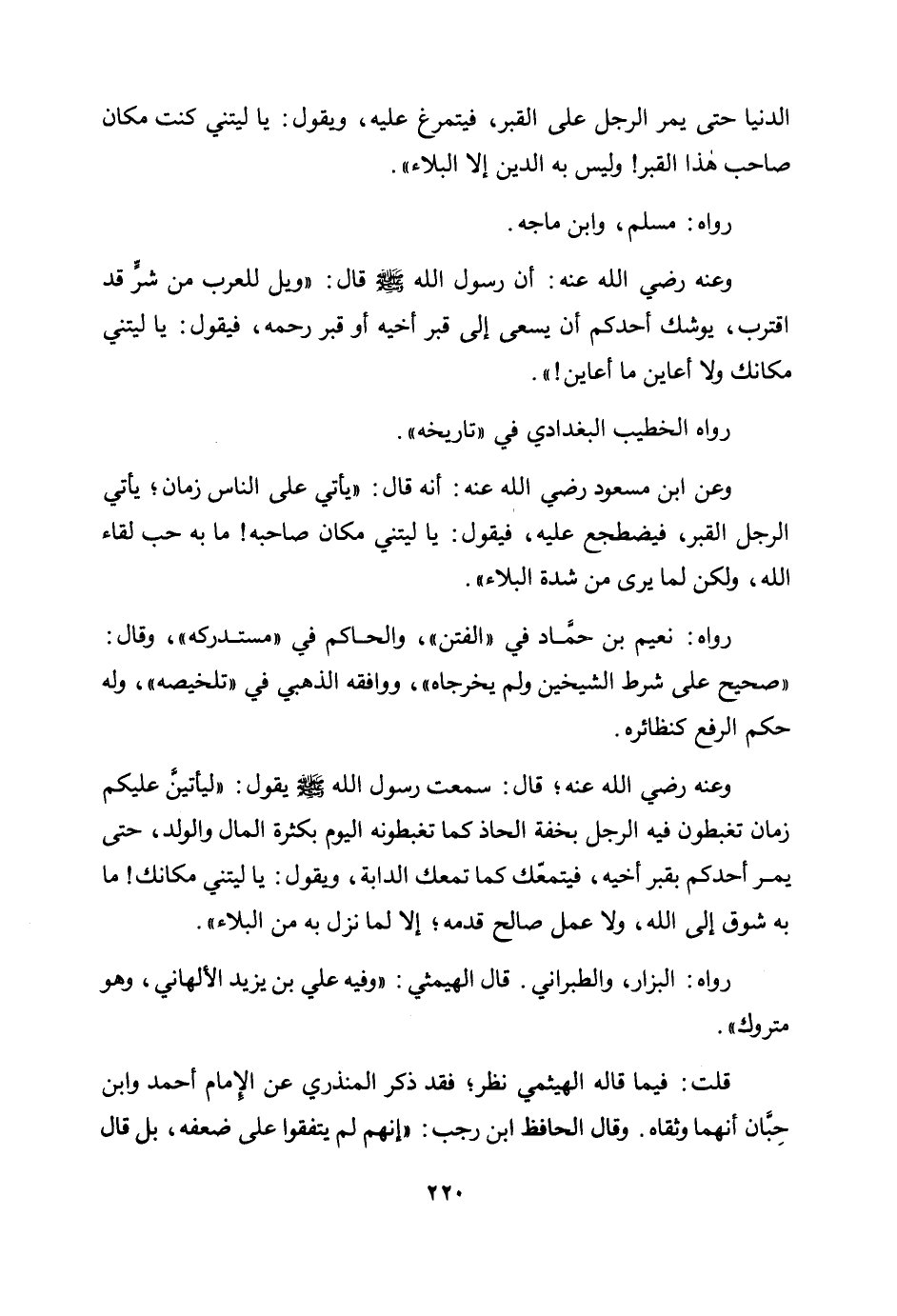 «الدنيا حتى يمر الرجل على القبر، فيتمرغ عليه، ويقول: يا ليتني كنت مكان صاحب هذا القبر! وليس به الدين إلا البلاء» .