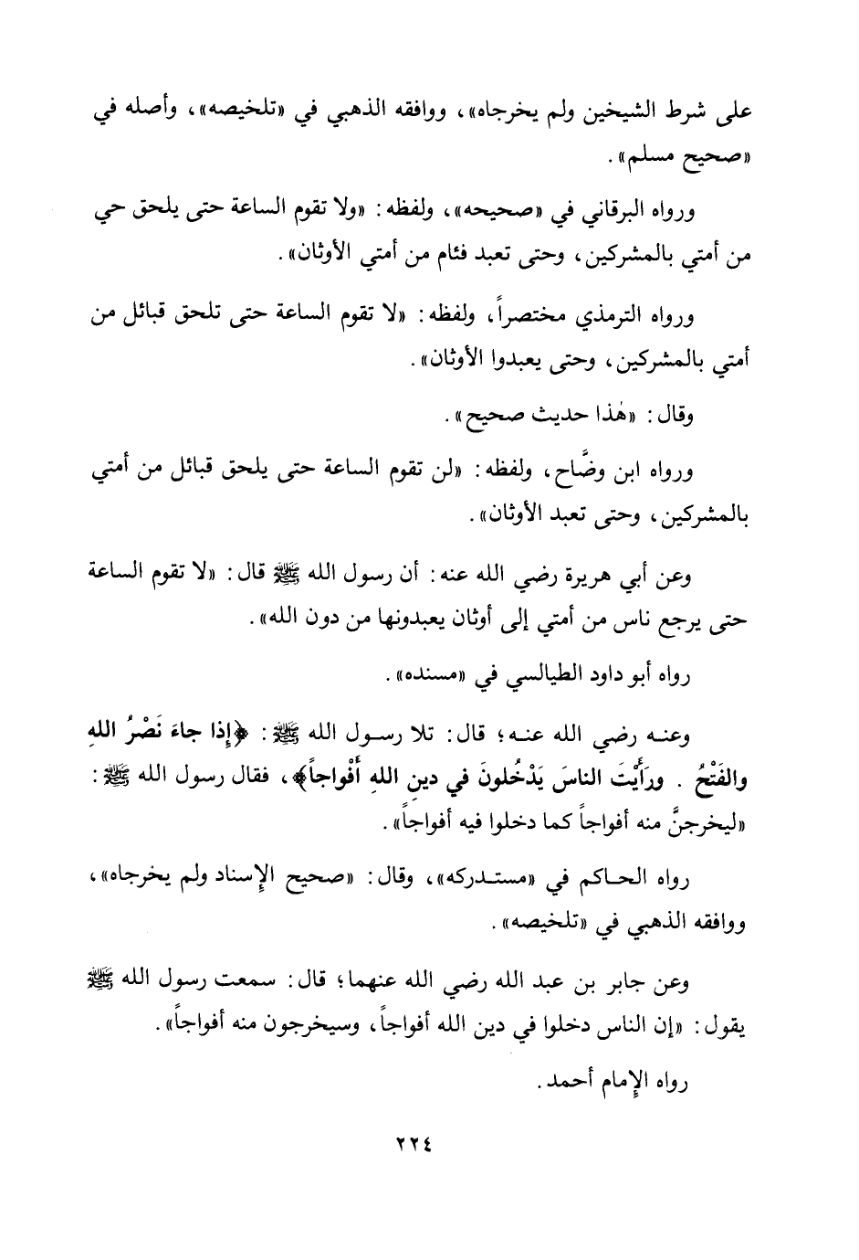 وعن أبي هريرة رضي الله عنه: أن رسول الله صلى الله عليه وسلم قال: «لا تقوم الساعة حتى يرجع ناس من أمتي إلى أوثان يعبدونها من دون الله» .