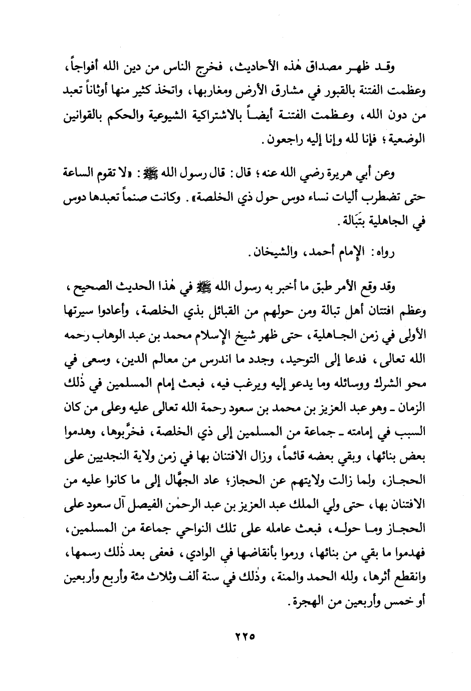 وقد وقع الأمر طبق ما أخبر به رسول الله صلى الله عليه وسلم في هذا الحديث الصحيح، وعظم افتتان أهل تبالة ومن حولهم من القبائل بذي الخلصة، وأعادوا سيرتها الأولى في الجاهلية، حتى ظهر شيخ الإسلام محمد بن عبد الوهاب رحمه الله تعالى، فدعا إلى التوحيد، وجدد ما اندرس من معالم الدين، وسعى في محو الشرك ووسائله وما يدعو إليه ويرغب فيه، فبعث إمام المسلمين في ذلك الزمان - وهو عبد العزيز بن محمد بن سعود رحمة الله تعالى عليه وعلى من كان السبب في إمامته - جماعة من المسلمين إلى ذي الخلصة، فخربوها، وهدموا بعض بنائها، وبقي بعضه قائمًا، وزال الافتنان بها في زمن ولاية النجديين على الحجاز، ولما زالت ولايتهم عن الحجاز؛ عاد الجهال إلى ما كانوا عليه من الافتنان بها، حتى ولي الملك عبد العزيز بن عبد الرحمن الفيصل آل سعود على الحجاز وما حوله، فبعث عامله على تلك النواحي جماعة من المسلمين، فهدموا ما بقي من بنائها، ورموا بأنقاضها في الوادي، فعفى بعد ذلك رسمها، وانقطع أثرها، ولله الحمد والمنة، وذلك في سنة ألف وثلاثمائة وأربع وأربعين أو خمس وأربعين من الهجرة.