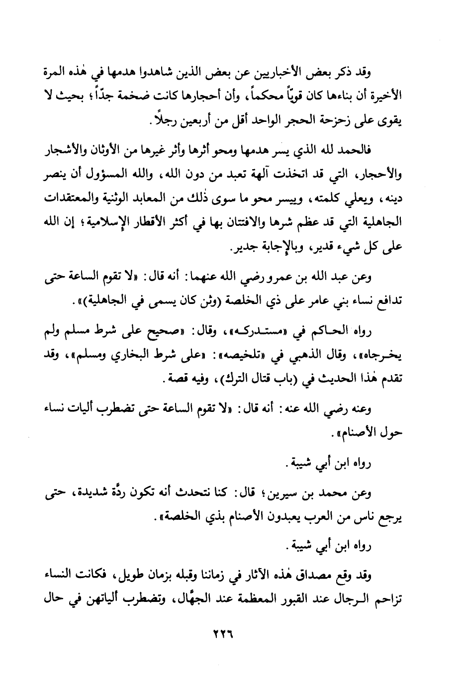 فالحمد لله الذي يسر هدمها ومحو أثرها غيرها من الأوثان والأشجار والأحجار، التي قد اتخذت آلهة تعبد من دون الله، والله المسؤول أن ينصر دينه، ويعلي كلمته، وييسر محو ما سوى ذلك من المعابد الوثنية والمعتقدات الجاهلية التي قد عظم شرها والافتنان بها في أكثر الأقطار الإسلامية؛ إن الله على كل شيء قدير، وبالإجابة جدير.
