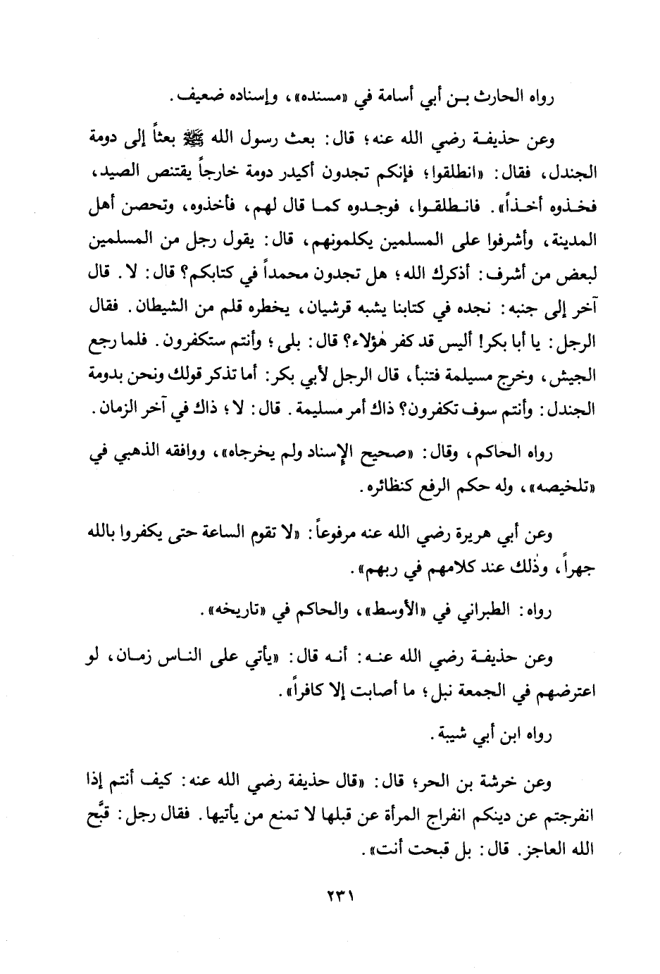 وعن حذيفة رضي الله عنه؛ قال: «بعث رسول الله صلى الله عليه وسلم بعثًا إلى دومة الجندل، فقال: "انطلقوا؛ فإنكم تجدون أكيدر دومة خارجًا يقتنص الصيد، فخذوه أخذًا". فانطلقوا، فوجدوه كما قال لهم، فأخذوه، وتحصن أهل المدينة، وأشرفوا على المسلمين يكلمونهم، قال: يقول رجل من المسلمين لبعض من أشرف: أذكرك الله؛ هل تجدون محمدًا في كتابكم؟ قال: لا. قال آخر إلى جنبه نجده في كتابنا يشبه قرشيان، يخطره قلم من الشيطان. فقال الرجل: يا أبا بكر! أليس قد كفر هؤلاء؟ قال: بلى؛ وأنتم ستكفرون. فلما رجع الجيش، وخرج مسيلمة فتنبأ، قال الرجل لأبي بكر: أما تذكر قولك ونحن بدومة الجندل: وأنتم سوف تكفرون؟ ذاك أمر مسيلمة. قال: لا؛ ذاك في آخر الزمان» .