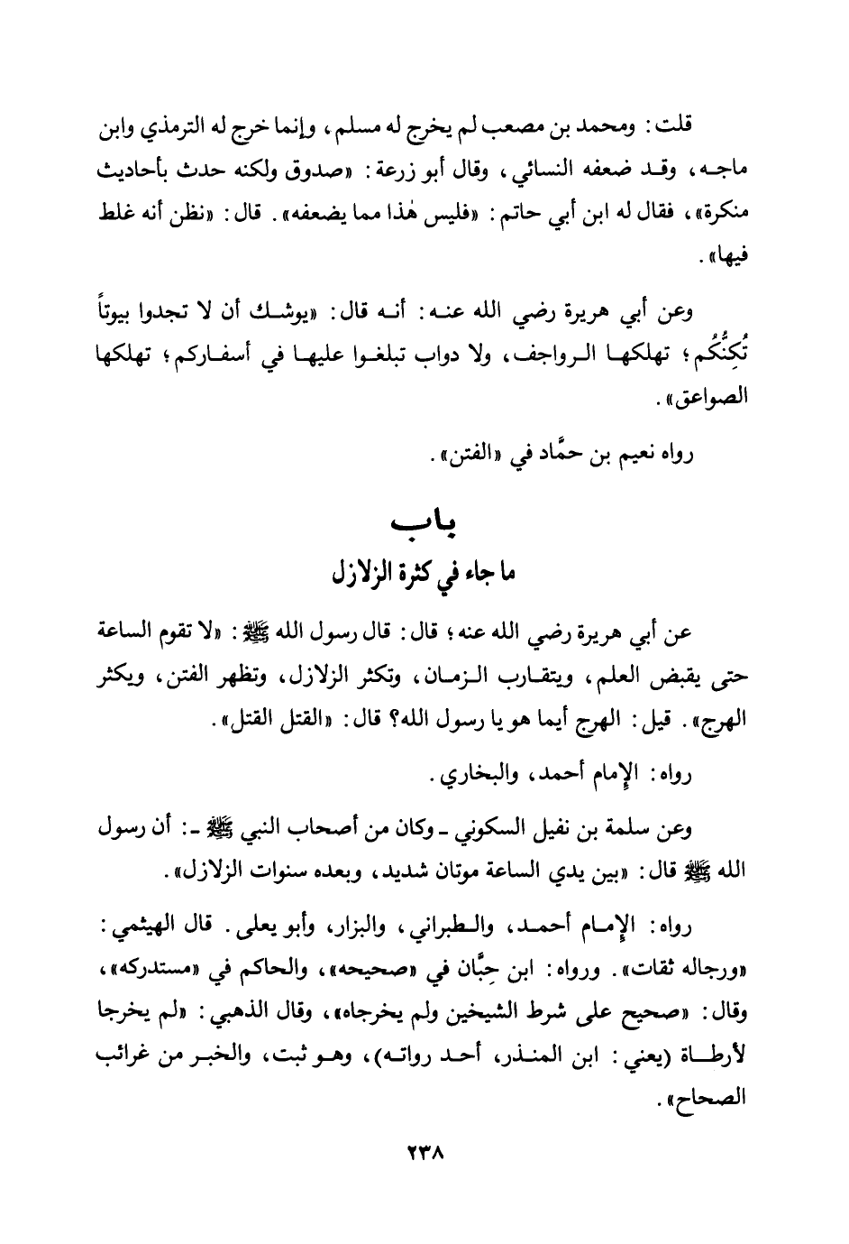 عن أبي هريرة؛ قال: قال رسول الله صلى الله عليه وسلم: «"لا تقوم الساعة حتى يقبض العلم، ويتقارب الزمان، وتكثر الزلازل، وتظهر الفتن، ويكثر الهرج". قيل: الهرج أيما هو يا رسول الله؟ قال: "القتل القتل» .