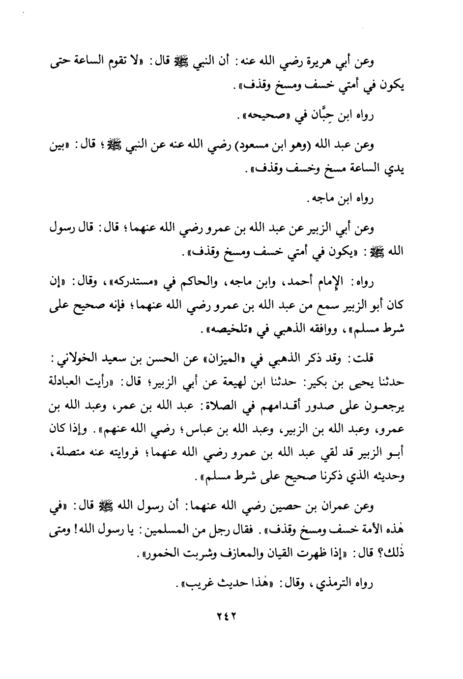 وعن أبي الزبير عن عبد الله بن عمرو رضي الله عنهما؛ قال: قال رسول الله صلى الله عليه وسلم: «يكون في أمتي خسف ومسخ وقذف» .
