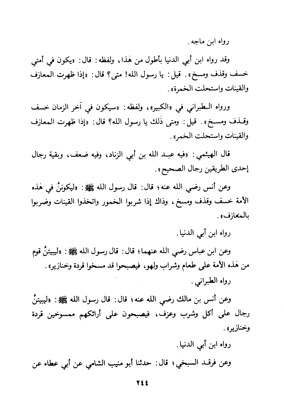 وعن أنس رضي الله عنه؛ قال: قال رسول الله صلى الله عليه وسلم: «ليكونن في هذه الأمة خسف وقذف ومسخ، وذاك إذا شربوا الخمور واتخذوا القينات وضربوا بالمعازف» .