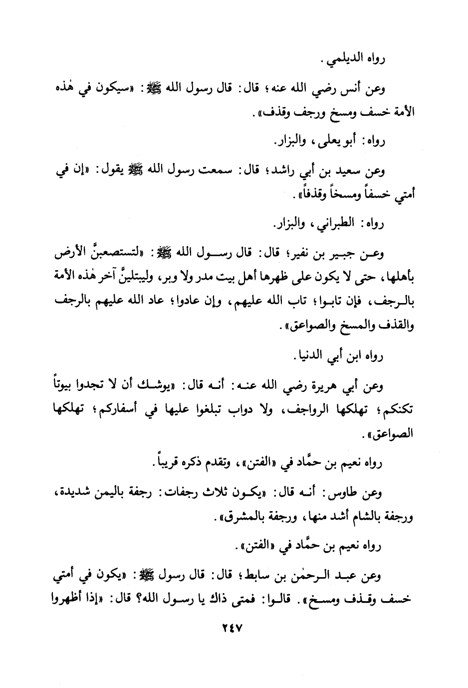 وعن جبير بن نفير؛ قال: قال رسول الله صلى الله عليه وسلم: «لتستصعبن الأرض بأهلها، حتى لا يكون على ظهرها أهل بيت مدر ولا وبر، وليبتلين آخر هذه الأمة بالرجف، فإن تابوا؛ تاب الله عليهم، وإن عادوا؛ عاد الله عليهم بالرجف والقذف والمسخ والصواعق» .