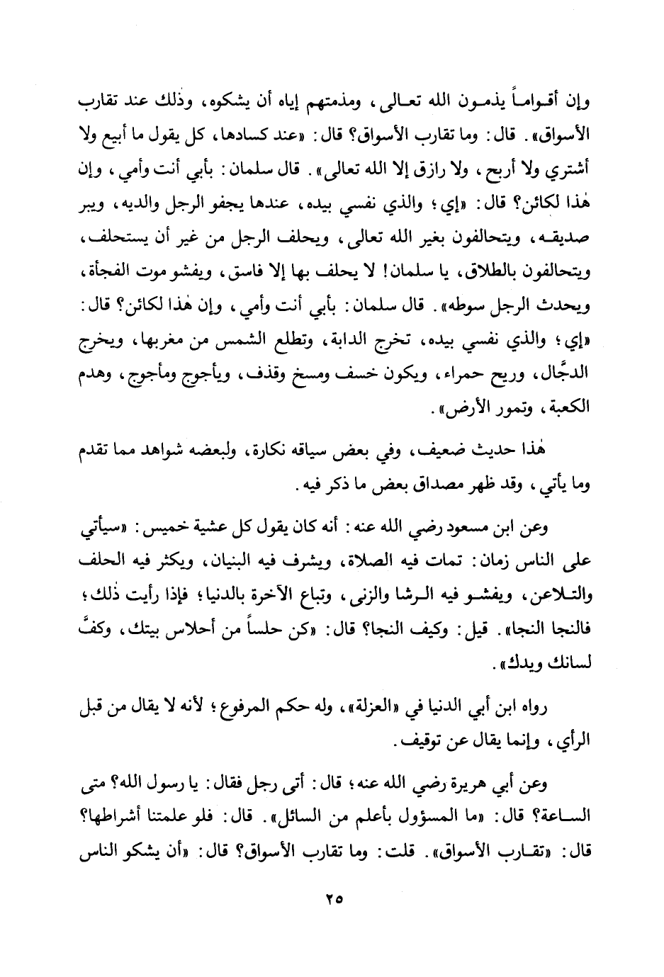 «وإن أقوامًا يذمون الله تعالى، ومذمتهم إياه أن يشكوه، وذلك عند تقارب الأسواق". قال: وما تقارب الأسواق؟ قال: "عند كسادها، كل يقول ما أبيع ولا أشتري ولا أربح، ولا رازق إلا الله تعالى ". قال سلمان: بأبي أنت وأمي، وإن هذا لكائن؟ قال: "إي؛ والذي نفسي بيده، عندها يجفو الرجل والديه، ويبر صديقه، ويتحالفون بغير الله تعالى، ويحلف الرجل من غير أن يستحلف، ويتحالفون بالطلاق، يا سلمان! لا يحلف بها إلا فاسق، ويفشو موت الفجأة، ويحدث الرجل سوطه". قال سلمان: بأبي أنت وأمي، وإن هذا لكائن؟ قال: "إي؛ والذي نفسي بيده، تخرج الدابة، وتطلع الشمس من مغربها، ويخرج الدجال، وريح حمراء، ويكون خسف ومسخ وقذف، ويأجوج ومأجوج، وهدم الكعبة، وتمور الأرض» .