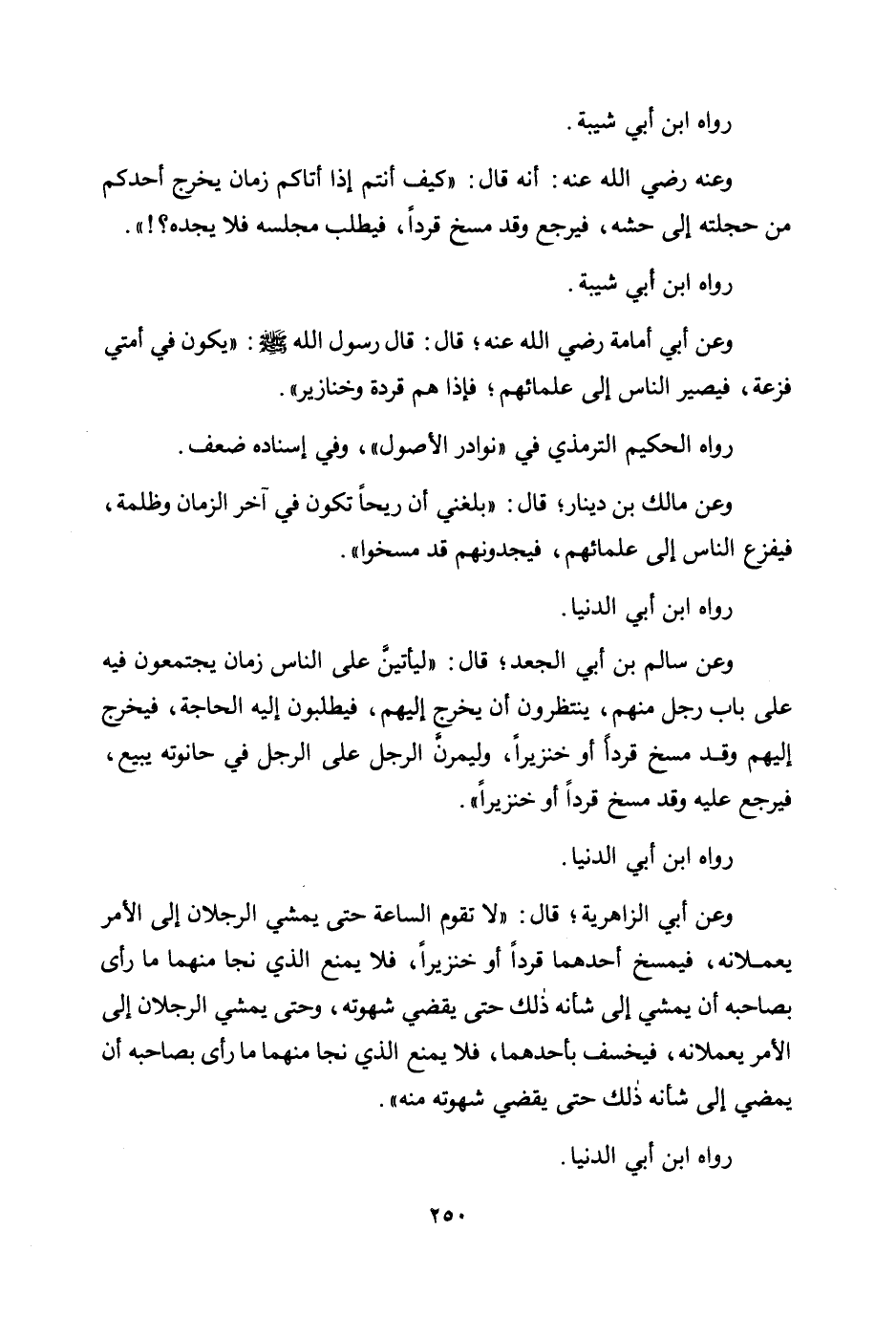 وعن أبي الزاهرية؛ قال: "لا تقوم الساعة حتى يمشي الرجلان إلى الأمر يعملانه، فيمسخ أحدهما قردًا أو خنزيرًا، فلا يمنع الذي نجا منهما ما رأى بصاحبه أن يمشي إلى شأنه ذلك حتى يقضي شهوته، وحتى يمشي الرجلان إلى الأمر يعملانه، فيخسف بأحدهما، فلا يمنع الذي نجا منهما ما رأى بصاحبه أن يمضي إلى شأنه ذلك حتى يقضي شهوته منه".