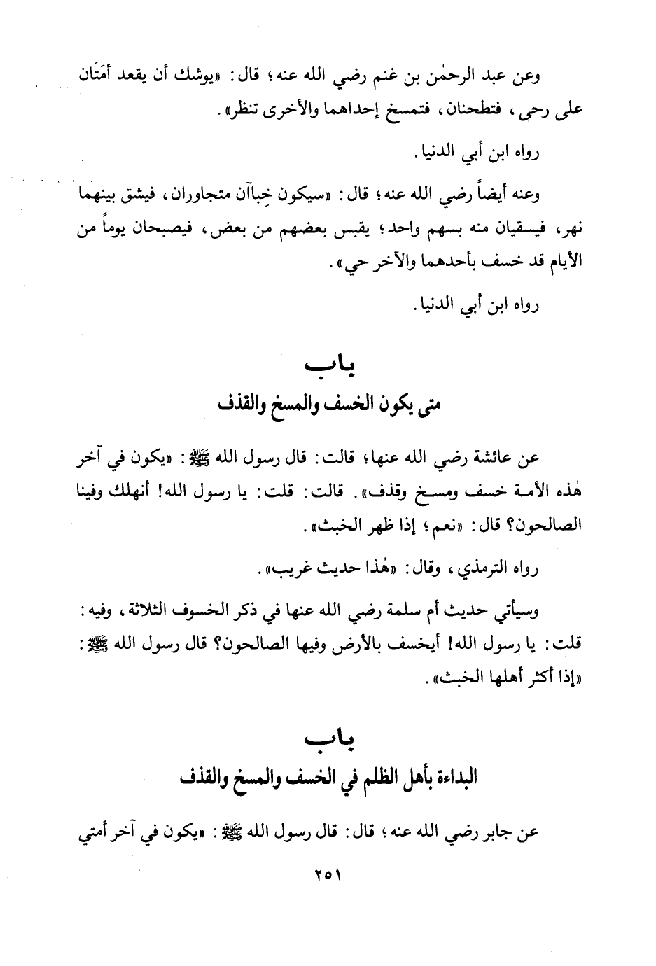 عن عائشة رضي الله عنها؛ قالت: قال رسول الله صلى الله عليه وسلم: «"يكون في آخر هذه الأمة خسف ومسخ وقذف ". قالت: قلت: يا رسول الله! أنهلك وفينا الصالحون؟ قال: "نعم؛ إذا ظهر الخبث"» .