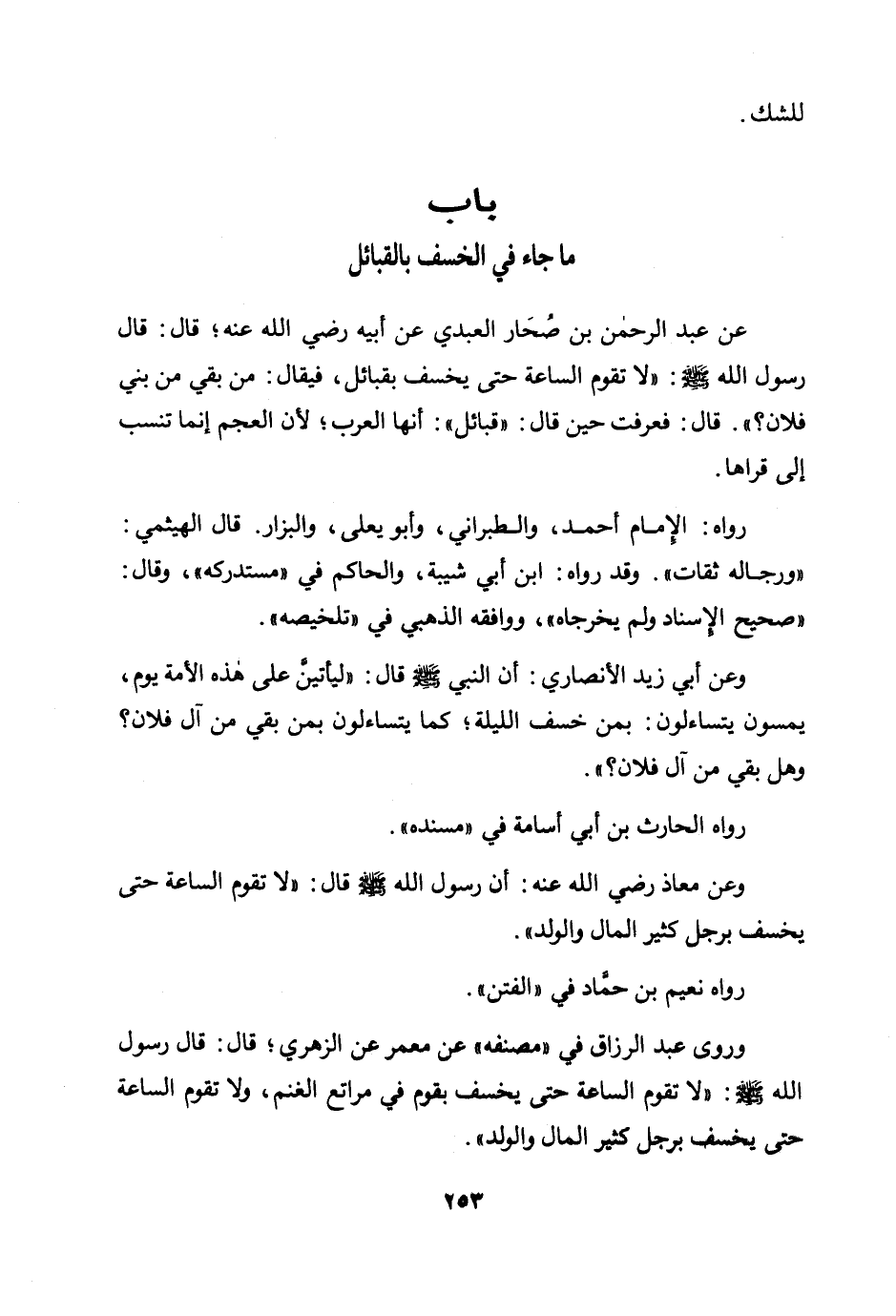 عن عبد الرحمن بن صحار العبدي عن أبيه رضي الله عنه؛ قال: قال رسول الله صلى الله عليه وسلم: «لا تقوم الساعة حتى يخسف بقبائل، فيقال: من بقي من بني فلان؟» . قال: فعرفت حين قال: "قبائل": أنها العرب؛ لأن العجم إنما تنسب إلى قراها.