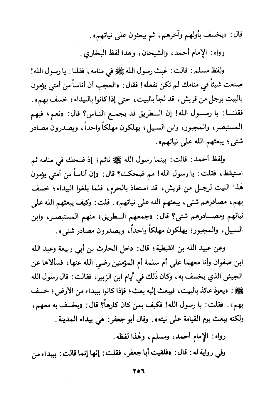 رواه: الإمام أحمد، والشيخان، وهذا لفظ البخاري. ولفظ مسلم: قالت: «عبث رسول الله صلى الله عليه وسلم في منامه، فقلنا: يا رسول الله! صنعت شيئًا في منامك لم تكن تفعله! فقال: "العجب أن أناسًا من أمتي يؤمون بالبيت برجل من قريش، قد لجأ بالبيت، حتى إذا كانوا بالبيداء؛ خسف بهم". فقلنا: يا رسول الله! إن الطريق قد يجمع الناس؟ قال: "نعم؛ فيهم المستبصر، والمجبور، وابن السبيل؛ يهلكون مهلكًا واحدًا، ويصدرون مصادر شتى؛ يبعثهم الله على نياتهم» .