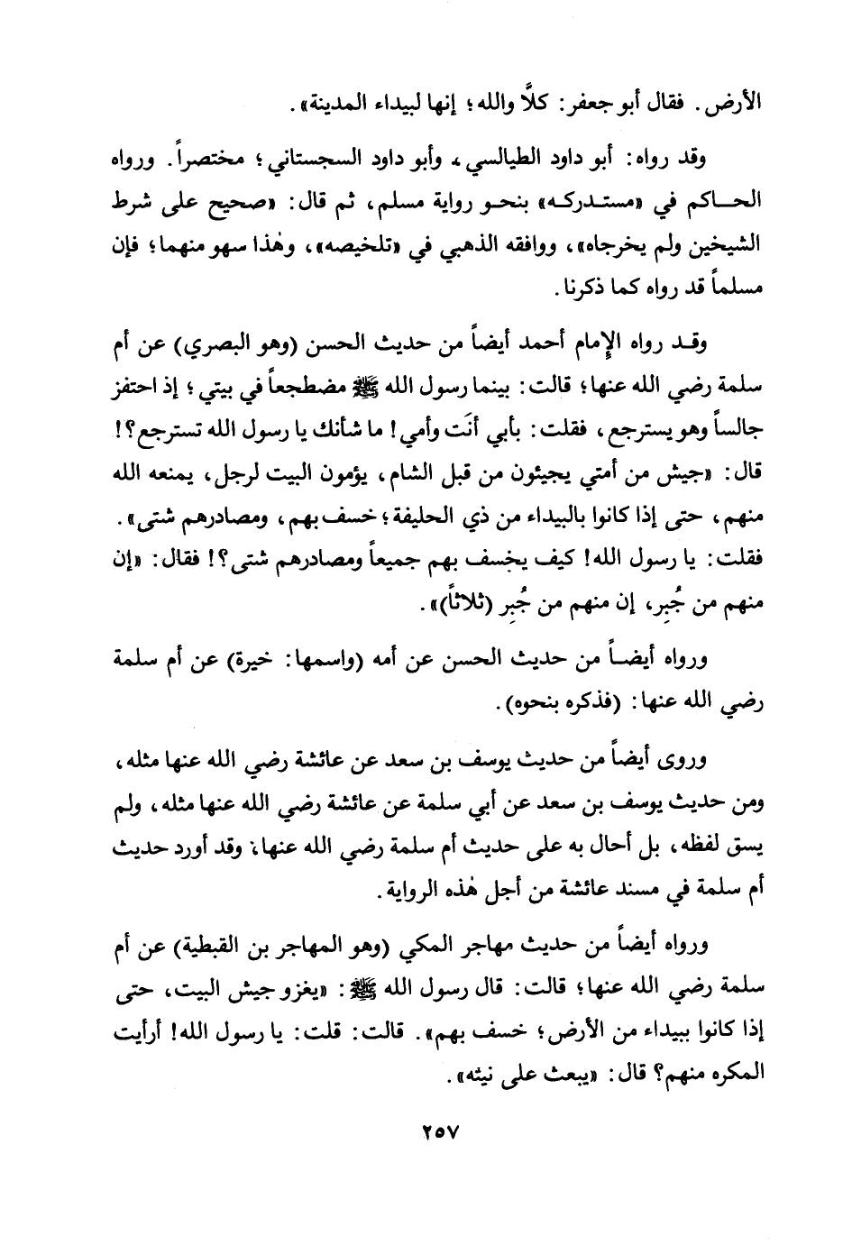 وقد رواه الإمام أحمد أيضًا من حديث الحسن (وهو البصري) عن أم سلمة رضي الله عنها؛ قالت: «بينما رسول الله صلى الله عليه وسلم مضطجعًا في بيتي؛ إذ احتفز جالسًا وهو يسترجع، فقلت: بأبي أنت وأمي! ما شأنك يا رسول الله تسترجع؟ ! قال: "جيش من أمتي يجيئون من قبل الشام، يؤمون البيت لرجل، يمنعه الله منهم، حتى إذا كانوا بالبيداء من ذي الحليفة؛ خسف بهم، ومصادرهم شتى". فقلت: يا رسول الله! كيف يخسف بهم جميعًا ومصادرهم شتى؟ ! فقال: "إن منهم من جبر، إن منهم من جبر (ثلاثًا) » .