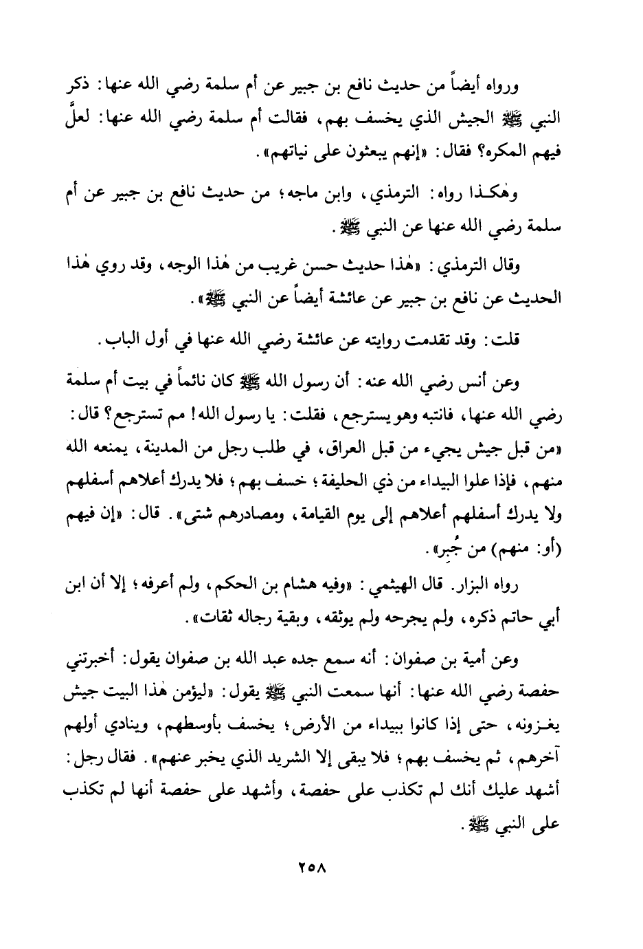 وعن أمية بن صفوان: أنه سمع جده عبد الله بن صفوان يقول: أخبرتني حفصة رضي الله عنها: أنها سمعت النبي صلى الله عليه وسلم يقول: «ليؤمن هذا البيت جيش يغزونه، حتى إذا كانوا ببيداء من الأرض؛ يخسف بأوسطهم، وينادي أولهم آخرهم، ثم يخسف بهم؛ فلا يبقى إلا الشريد الذي يخبر عنهم» . فقال رجل: أشهد عليك أنك لم تكذب على حفصة، وأشهد على حفصة أنها لم تكذب على النبي صلى الله عليه وسلم.