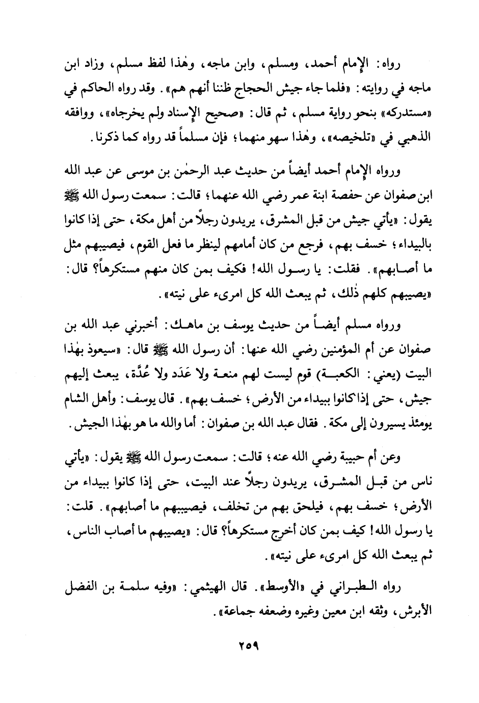ورواه الإمام أحمد أيضًا من حديث عبد الرحمن بن موسى عن عبد الله ابن صفوان عن حفصة ابنة عمر رضي الله عنهما؛ قالت: سمعت رسول الله صلى الله عليه وسلم يقول: «"يأتي جيش من قبل المشرق، يريدون رجلًا من أهل مكة، حتى إذا كانوا بالبيداء؛ خسف بهم، فرجع من كان أمامهم لينظر ما فعل القوم، فيصيبهم مثل ما أصابهم ". فقلت: يا رسول الله! فكيف بمن كان منهم مستكرهًا؟ قال: "يصيبهم كلهم ذلك، ثم يبعث الله كل امرئ على نيته» .