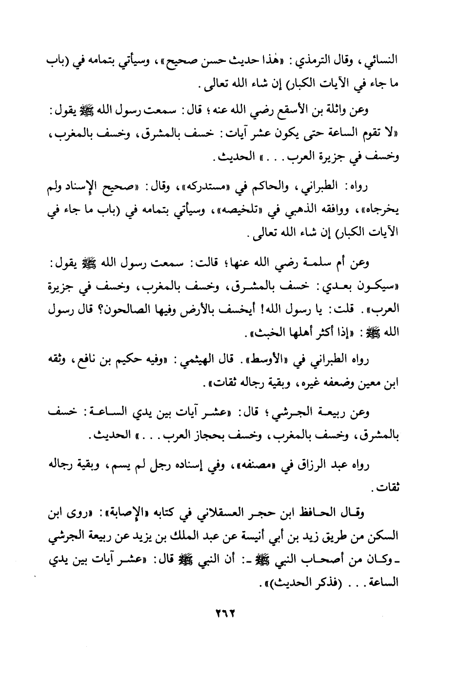 وعن واثلة بن الأسقع رضي الله عنه؛ قال: سمعت رسول الله صلى الله عليه وسلم يقول: «لا تقوم الساعة حتى يكون عشر آيات: خسف بالمشرق، وخسف بالمغرب، وخسف في جزيرة العرب ... » الحديث.