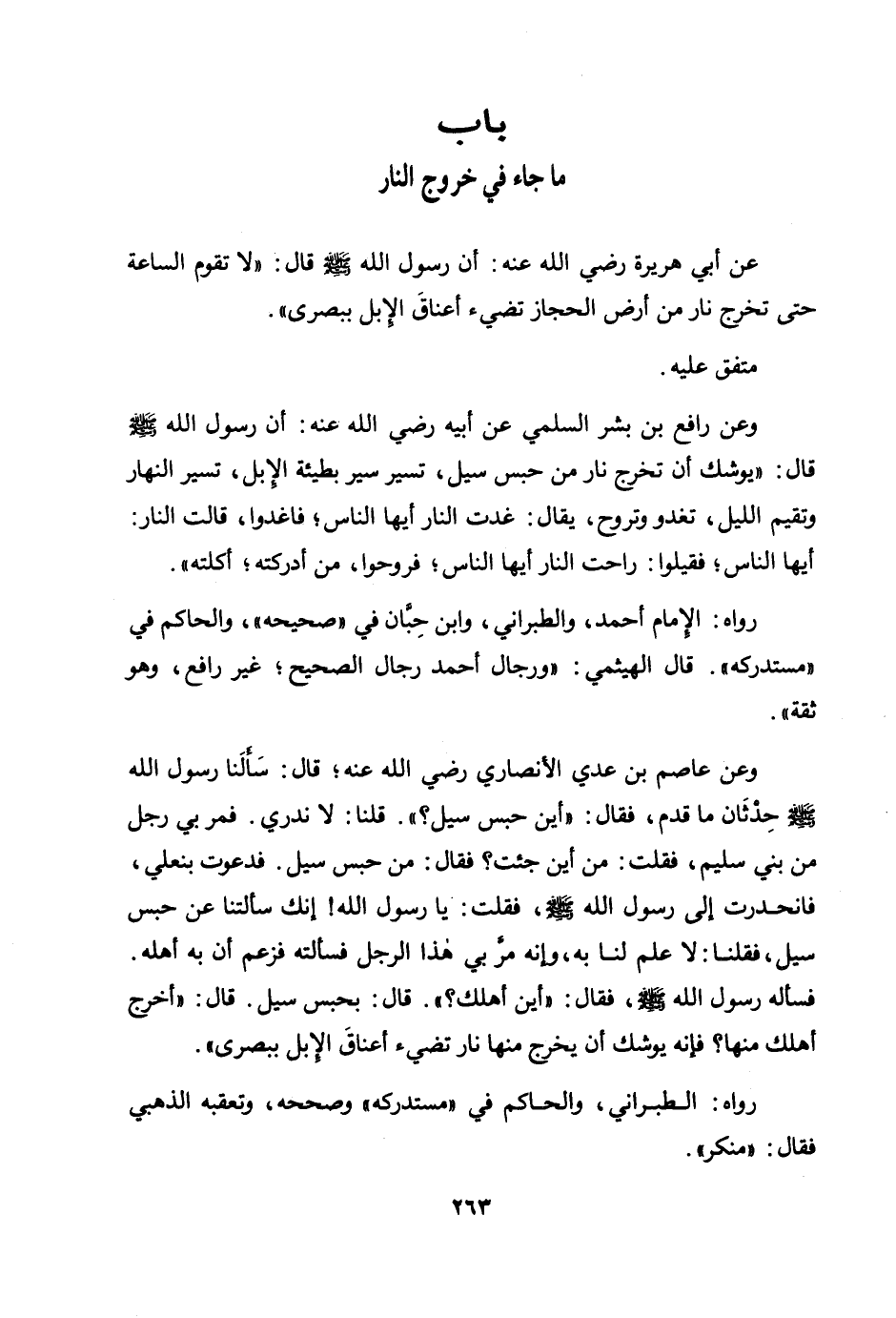 عن أبي هريرة رضي الله عنه: أن رسول الله صلى الله عليه وسلم قال: «لا تقوم الساعة حتى تخرج نار من أرض الحجاز تضيء أعناق الإبل ببصرى» .