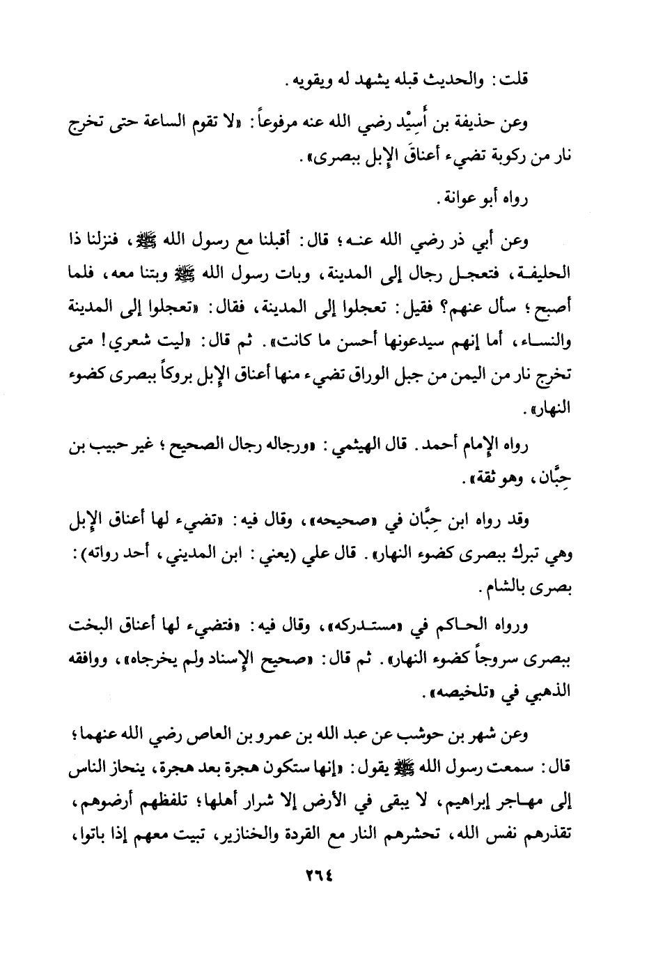 ورواه الحاكم في "مستدركه"، وقال فيه: «فتضيء لها أعناق البخت ببصرى سروجًا كضوء النهار» . ثم قال: "صحيح الإسناد ولم يخرجاه"، ووافقه الذهبي في "تلخيصه".