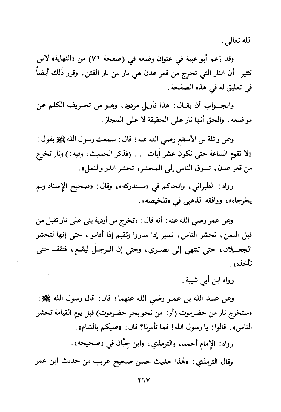 وقد زعم أبو عبية في عنوان وضعه في (صفحة 71) من "النهاية" لابن كثير: أن النار التي تخرج من قعر عدن هي نار من نار الفتن، وقرر ذلك أيضًا في تعليق له في هذه الصفحة.