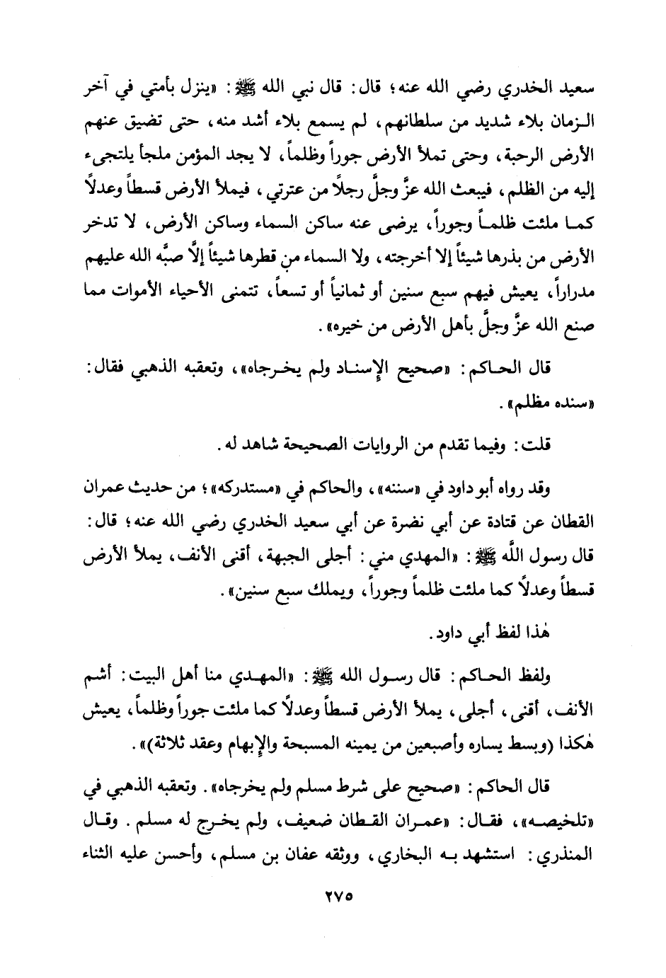 سعيد الخدري رضي الله عنه؛ قال: قال نبي الله صلى الله عليه وسلم: «ينزل بأمتي في آخر الزمان بلاء شديد من سلطانهم، لم يسمع بلاء أشد منه، حتى تضيق عنهم الأرض الرحبة، وحتى تملأ الأرض جورًا وظلمًا، لا يجد المؤمن ملجأ يلتجئ إليه من الظلم، فيبعث الله عز وجل رجلًا من عترتي، فيملأ الأرض قسطًا وعدلًا كما ملئت ظلمًا وجورًا، يرضى عنه ساكن السماء وساكن الأرض، لا تدخر الأرض من بذرها شيئًا إلا أخرجته، ولا السماء من قطرها شيئًا إلا صبه الله عليهم مدرارًا، يعيش فيهم سبع سنين أو ثمانيًا أو تسعًا، تتمنى الأحياء الأموات مما صنع الله عز وجل بأهل الأرض من خيره» .