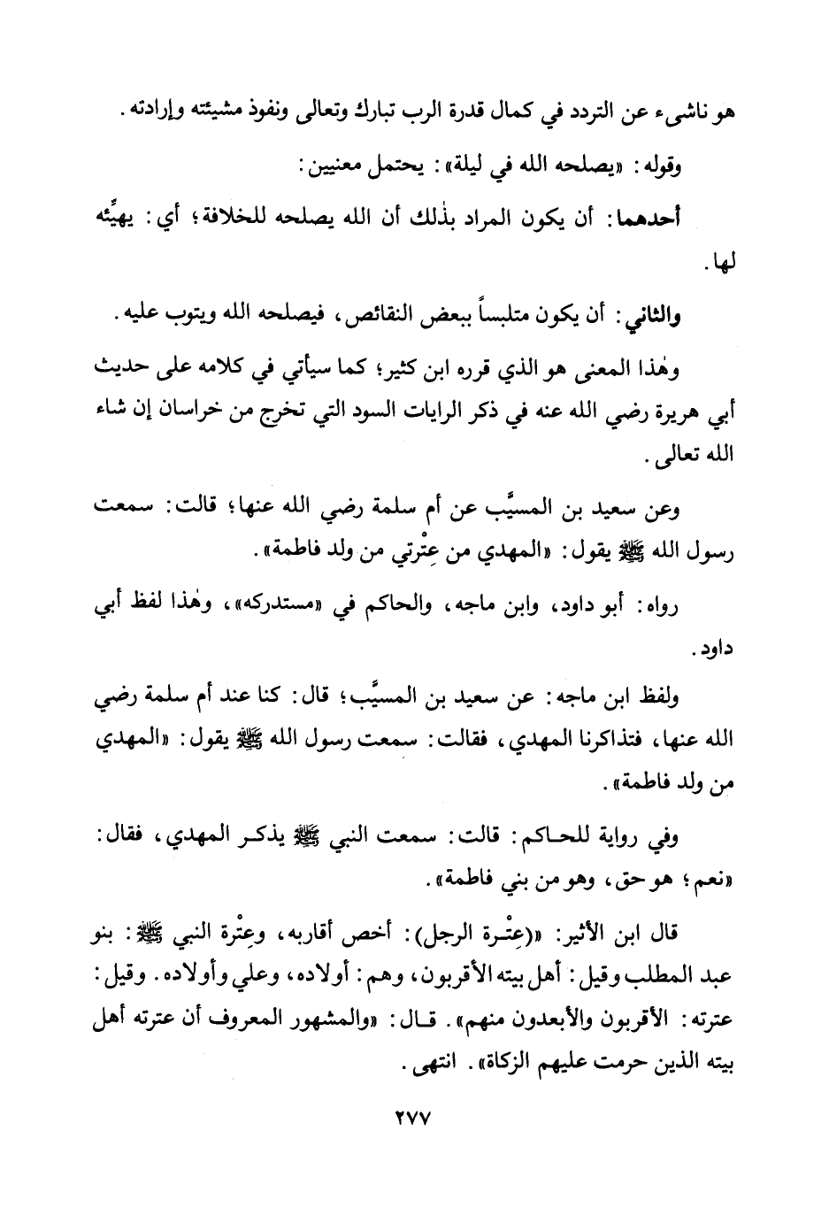 وعن سعيد بن المسيب عن أم سلمة رضي الله عنها؛ قالت: سمعت رسول الله صلى الله عليه وسلم يقول: «المهدي من عترتي من ولد فاطمة» .
