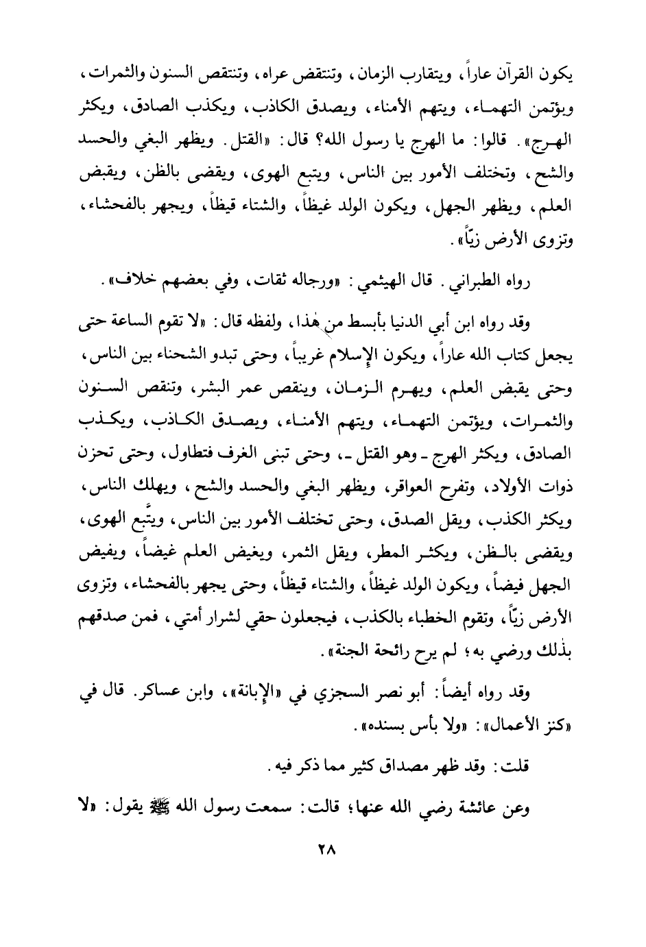 «يكون القرآن عارا، ويتقارب الزمان، وتنتقض عراه، وتنتقص السنون والثمرات، ويؤتمن التهماء، ويتهم الأمناء، ويصدق الكاذب، ويكذب الصادق، ويكثر الهرج". قالوا: ما الهرج يا رسول الله؟ قال: "القتل. ويظهر البغي والحسد والشح، وتختلف الأمور بين الناس، ويتبع الهوى، ويقضى بالظن، ويقبض العلم، ويظهر الجهل، ويكون الولد غيظًا، والشتاء قيظًا، ويجهر بالفحشاء، وتزوى الأرض زيًا» .