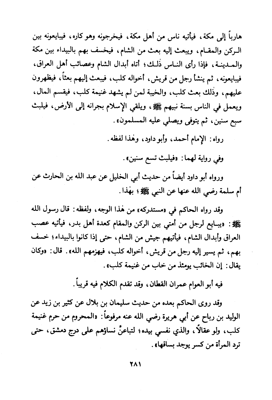 وقد رواه الحاكم في "مستدركه" من هذا الوجه، ولفظه: قال رسول الله صلى الله عليه وسلم: «"يبايع لرجل من أمتي بين الركن والمقام كعدة أهل بدر، فيأتيه عصب العراق وأبدال الشام، فيأتيهم جيش من الشام، حتى إذا كانوا بالبيداء؛ خسف بهم، ثم يسير إليه رجل من قريش، أخواله كلب، فيهزمهم الله» . قال: "وكان يقال: إن الخائب يومئذ من خاب من غنيمة كلب".