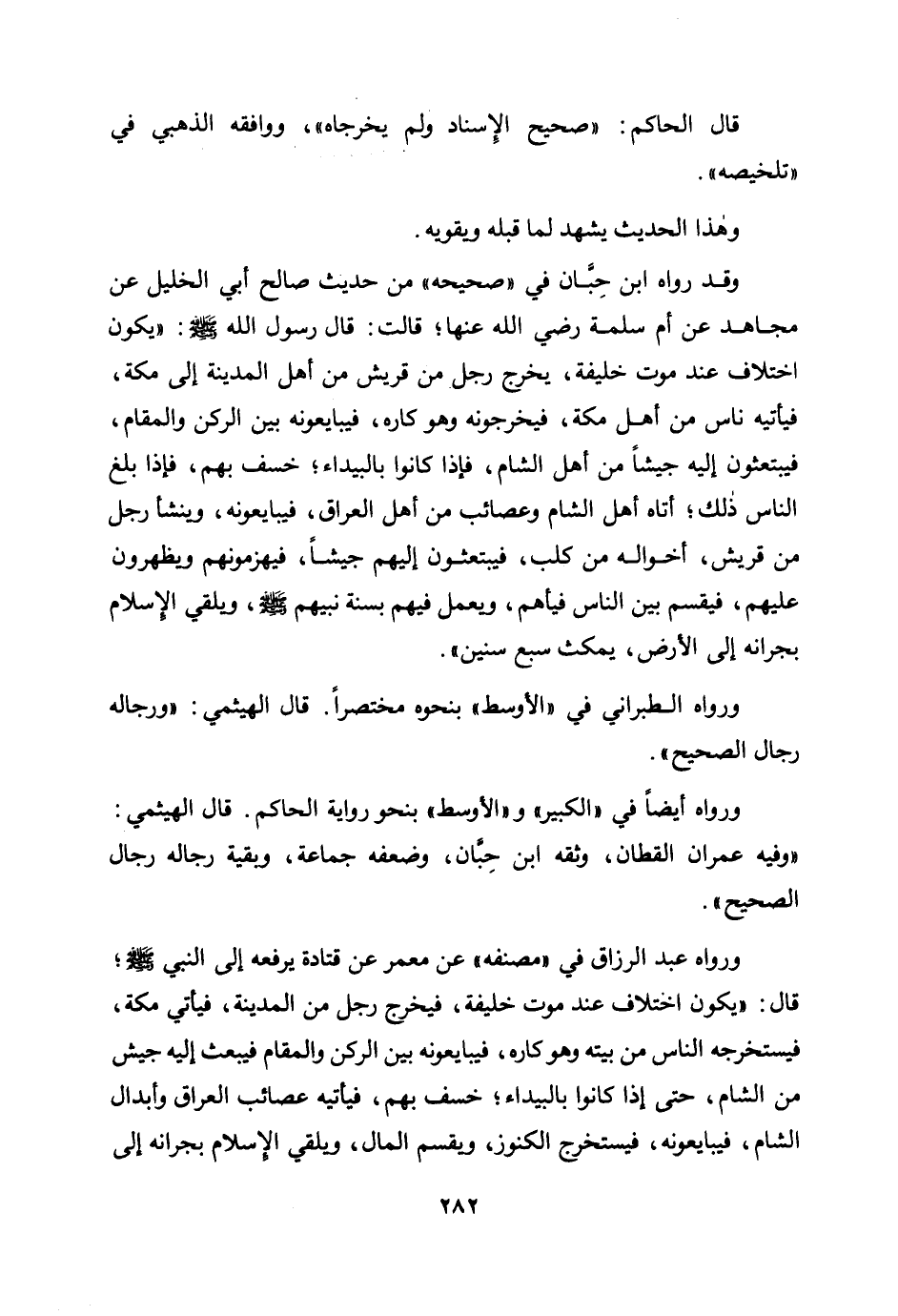 وقد رواه ابن حبان في "صحيحه" من حديث صالح أبي الخليل عن مجاهد عن أم سلمة رضي الله عنها؛ قالت: قال رسول الله صلى الله عليه وسلم: «يكون اختلاف عند موت خليفة، يخرج رجل من قريش من أهل المدينة إلى مكة، فيأتيه ناس من أهل مكة، فيخرجونه وهو كاره، فيبايعونه بين الركن والمقام، فيبتعثون إليه جيشًا من أهل الشام، فإذا كانوا بالبيداء؛ خسف بهم، فإذا بلغ الناس ذلك؛ أتاه أهل الشام وعصائب من أهل العراق، فيبايعونه، وينشأ رجل من قريش، أخواله من كلب، فيبتعثون إليهم جيشًا، فيهزمونهم ويظهرون عليهم، فيقسم بين الناس فيأهم، ويعمل فيهم بسنة نبيهم صلى الله عليه وسلم، ويلقي الإسلام بجرانه إلى الأرض، يمكث سبع سنين» . ورواه الطبراني في "الأوسط" بنحوه مختصرًا. قال الهيثمي: "ورجاله رجال الصحيح".