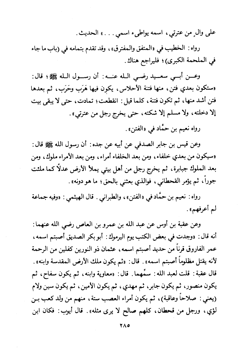 وعن عقبة بن أوس عن عبد الله بن عمرو بن العاص رضي الله عنهما: أنه قال: "وجدت في بعض الكتب يوم اليرموك: أبو بكر الصديق أصبتم اسمه، عمر الفاروق قرنًا من حديد أصبتم اسمه، عثمان ذو النورين كفلين من الرحمة لأنه يقتل مظومًا أصبتم اسمه". قال: "ثم يكون ملك الأرض المقدسة وابنه". قال عقبة: قلت لعبد الله: سمهما. قال: " معاوية وابنه، ثم يكون سفاح، ثم يكون منصور، ثم يكون جابر، ثم مهدي، ثم يكون الأمين، ثم يكون سين ولام (يعني: صلاحًا وعاقبة) ، ثم يكون أمراء العصب ستة، منهم من ولد كعب بن لؤي، ورجل من قحطان، كلهم صالح لا يرى مثله". قال أيوب: فكان ابن
