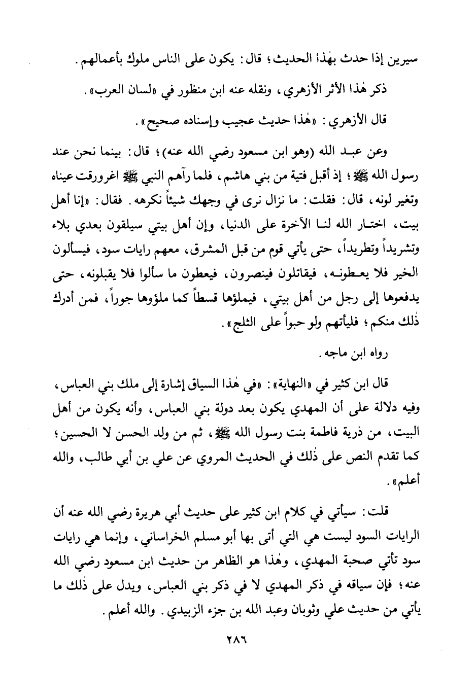 وعن عبد الله (وهو ابن مسعود رضي الله عنه) ؛ قال: «بينما نحن عند رسول الله صلى الله عليه وسلم؛ إذ أقبل فتية من بني هاشم، فلما رآهم النبي صلى الله عليه وسلم اغرورقت عيناه وتغير لونه، قال: فقلت: ما نزال ترى في وجهك شيئًا نكرهه. فقال: "إنا أهل بيت، اختار الله لنا الآخرة على الدنيا، وإن أهل بيتي سيلقون بعدي بلاء وتشريدًا وتطريدًا، حتى يأتي قوم من قبل المشرق، ومعهم رايات سود، فيسألون الخير فلا يعطونه، فيقاتلون فينصرون، فيعطون ما سألوا فلا يقبلونه، حتى يدفعوها إلى رجل من أهل بيتي، فيملؤوها قسطًا كما ملؤوها جورًا، فمن أدرك ذلك منكم؛ فليأتهم ولو حبوًا على الثلج» .