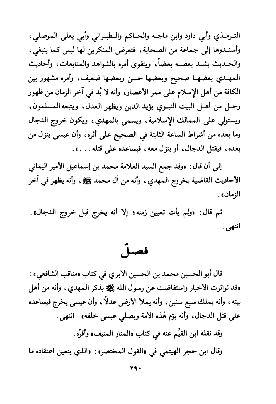 إلى أن قال: "وقد جمع السيد العلامة محمد بن إسماعيل الأمير اليماني الأحاديث القاضية بخروج المهدي، وأنه من آل محمد صلى الله عليه وسلم، وأنه يظهر في آخر الزمان".