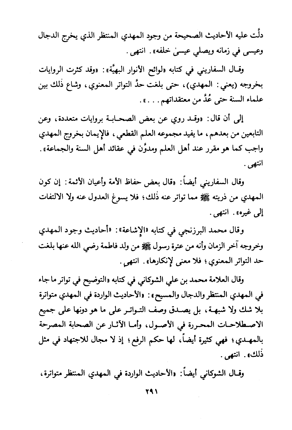 وقال السفاريني في كتابه "لوائح الأنوار البهية": "وقد كثرت الروايات بخروجه (يعني: المهدي) ، حتى بلغت حد التواتر المعنوي، وشاع ذلك بين علماء السنة حتى عد من معتقداتهم ... ".