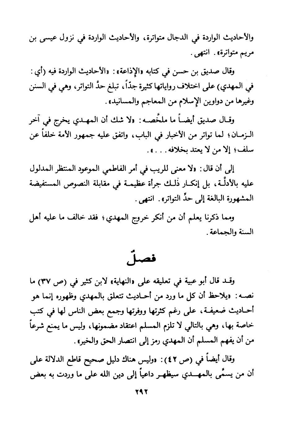 وقال صديق أيضًا ما ملخصه: "لا شك أن المهدي يخرج في آخر الزمان؛ لما تواتر من الأخبار في الباب، واتفق عليه جمهور الأمة خلفًا عن سلف؛ إلا من لا يعتد بخلافه.....".