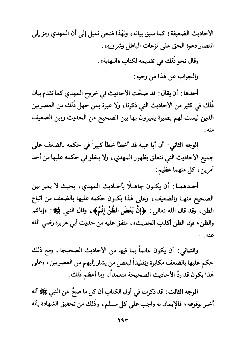 أحدهما: أن يكون جاهلًا بأحاديث المهدي، بحيث لا يميز بين الصحيح منها والضعيف، وعلى هذا يكون حكمه عليها بالضعف من اتباع الظن، وقد قال الله تعالى: {إِنَّ بَعْضَ الظَّنِّ إِثْمٌ} ، وقال النبي صلى الله عليه وسلم: «إياكم والظن؛ فإن الظن أكذب الحديث» ، متفق عليه من حديث أبي هريرة رضي الله عنه.