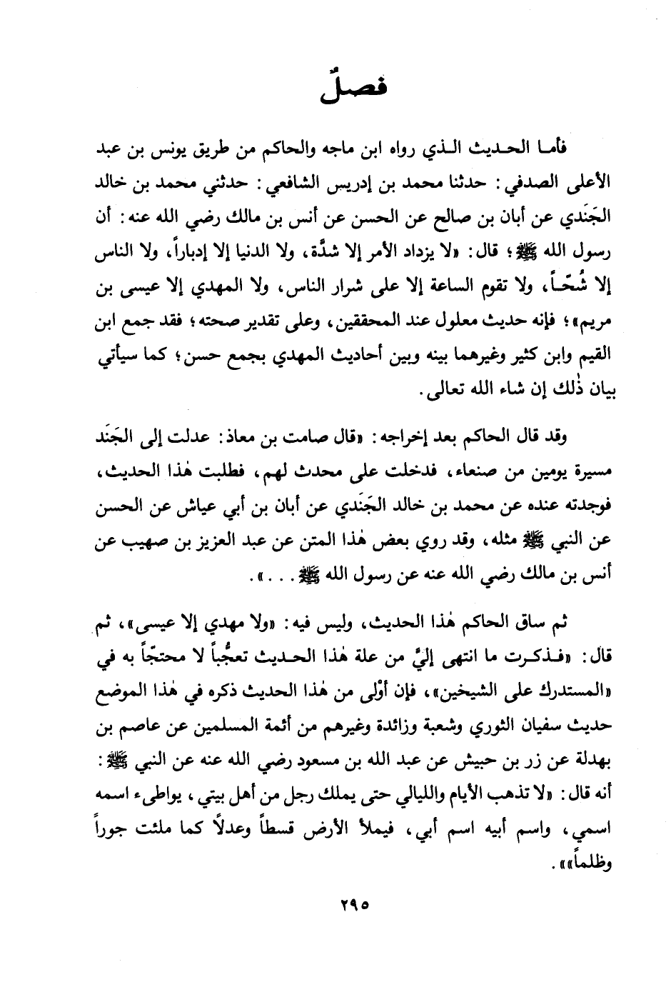 فأما الحديث الذي رواه ابن ماجه والحاكم من طريق يونس بن عبد الأعلى الصدفي: حدثنا محمد بن إدريس الشافعي: حدثني محمد بن خالد الجندي عن أبان بن صالح عن الحسن عن أنس بن مالك رضي الله عنه: أن رسول الله صلى الله عليه وسلم؛ قال: «لا يزداد الأمر إلا شدة، ولا الدنيا إلا إدبارًا، ولا الناس إلا شحًا، ولا تقوم الساعة إلا على شرار الناس، ولا المهدي إلا عيسى ابن مريم» ؛ فإنه حديث معلول عند المحققين، وعلى تقدير صحته؛ فقد جمع ابن القيم وابن كثير وغيرهما بينه وبين أحاديث المهدي بجمع حسن؛ كما سيأتي بيان ذلك إن شاء الله تعالى.