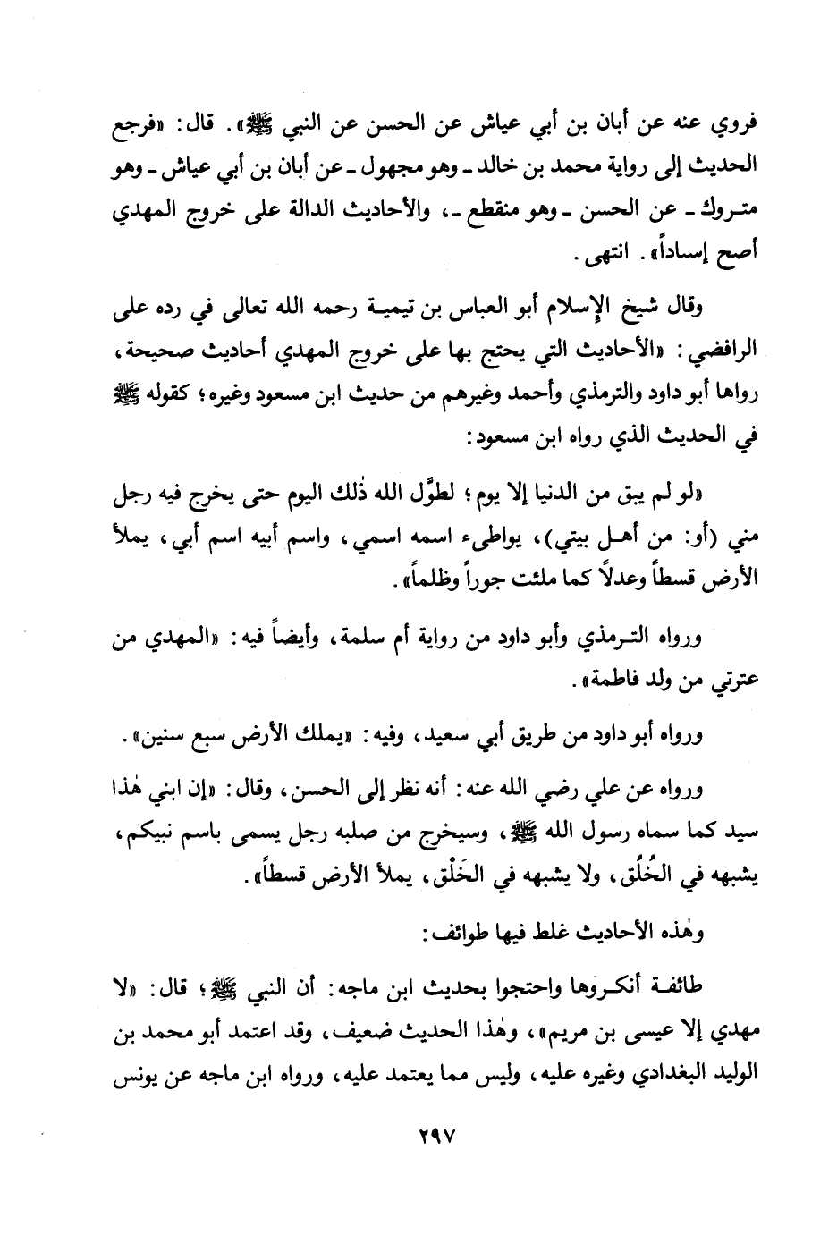 وقال شيخ الإسلام أبو العباس ابن تيمية رحمه الله تعالى في رده على الرافضي: " الأحاديث التي يحتج بها على خروج المهدي أحاديث صحيحة، رواها أبو داود والترمذي وأحمد وغيرهم من حديث ابن مسعود وغيره؛ كقوله صلى الله عليه وسلم في الحديث الذي رواه ابن مسعود: