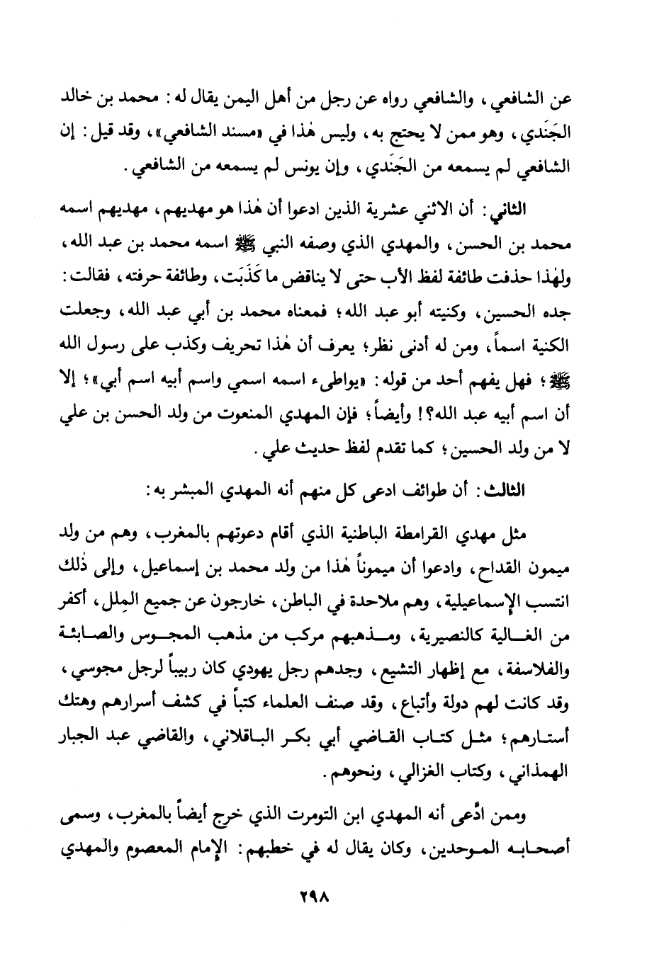 الثالث: أن طوائف ادعى كل منهم أنه المهدي المبشر به. مثل مهدي القرامطة الباطنية الذي أقام دعوتهم بالمغرب، وهم من ولد ميمون القداح، وادعوا أن ميمونًا هذا من ولد محمد بن إسماعيل، وإلى ذلك انتسب الإسماعيلية، وهم ملاحدة في الباطن، خارجون عن جميع الملل، وأكفر من الغالية كالنصيرية، ومذهبهم مركب من مذهب المجوس والصابئة والفلاسفة، مع إظهار التشيع، وجدهم رجل يهودي كان ربيبًا لرجل مجوسي، وقد كانت لهم دولة وأتباع، وقد صنف العلماء كتبًا في كشف أسرارهم وهتك أستارهم؛ مثل كتاب القاضي أبي بكر الباقلاني، والقاضي عبد الجبار الهمذاني، وكتاب الغزالي، ونحوهم.