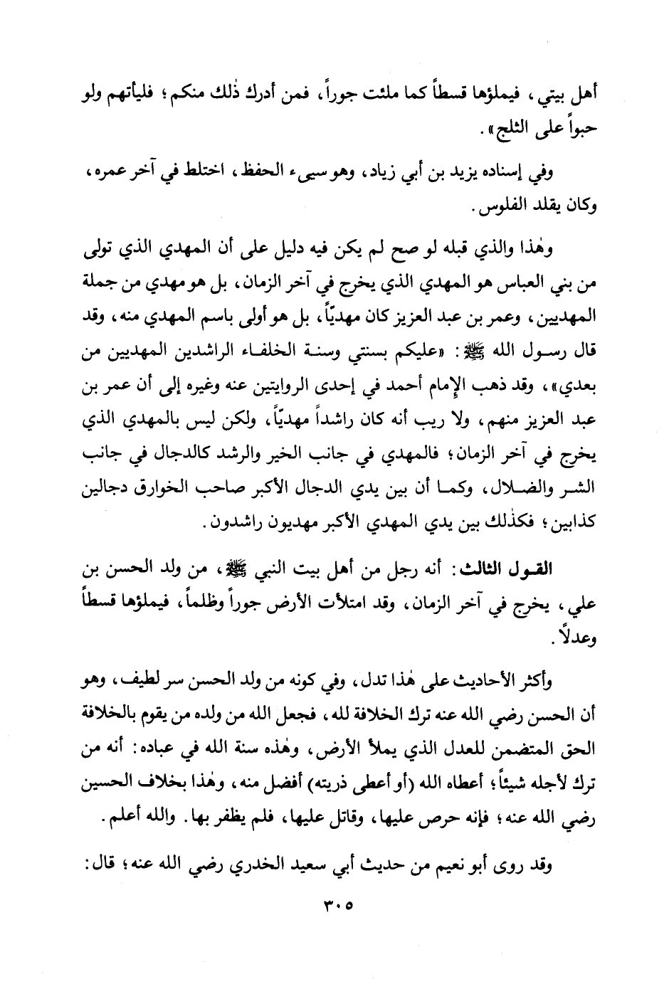 وهذا والذي قبله لو صح لم يكن فيه دليل على أن المهدي الذي تولى من بني العباس هو المهدي الذي يخرج في آخر الزمان، بل هو مهدي من جملة المهديين، وعمر بن عبد العزيز كان مهديًا، بل هو أولى باسم المهدي منه، وقد قال رسول الله صلى الله عليه وسلم: «عليكم بسنتي وسنة الخلفاء الراشدين المهديين من بعدي» ، وقد ذهب الإمام أحمد في إحدى الروايتين عنه وغيره إلى أن عمر بن عبد العزيز منهم، ولا ريب أنه كان راشدًا مهديا، ولكن ليس بالمهدي الذي يخرج في آخر الزمان؛ فالمهدي في جانب الخير والرشد كالدجال في جانب الشر والضلال، وكما أن بين يدي الدجال الأكبر صاحب الخوارق دجالين كذابين؛ فكذلك بين يدي المهدي الأكبر مهديون راشدون.