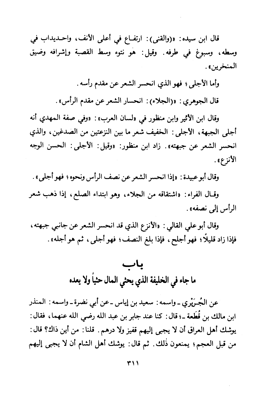 وقال أبو عبيدة: "إذا انحسر الشعر عن نصف الرأس ونحوه؛ فهو أجلى ".