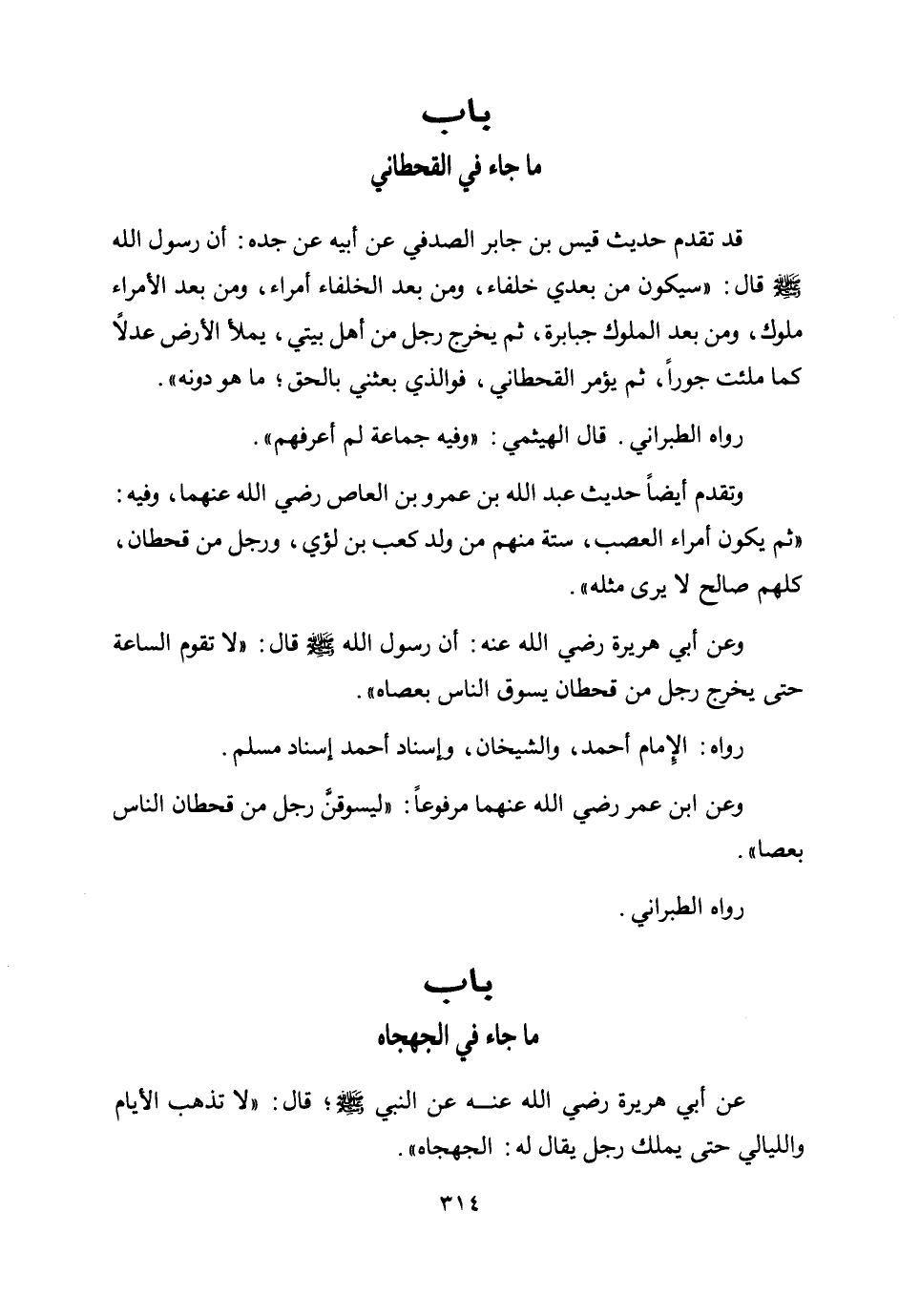 قد تقدم حديث قيس بن جابر الصدفي عن أبيه عن جده: أن رسول الله صلى الله عليه وسلم قال: «سيكون من بعدي خلفاء، ومن بعد الخلفاء أمراء، ومن بعد الأمراء ملوك، ومن بعد الملوك جبابرة، ثم يخرج رجل من أهل بيتي، يملأ الأرض عدلًا كما ملئت جورًا، ثم يؤمر القحطاني، فوالذي بعثني بالحق؛ ما هو دونه» .